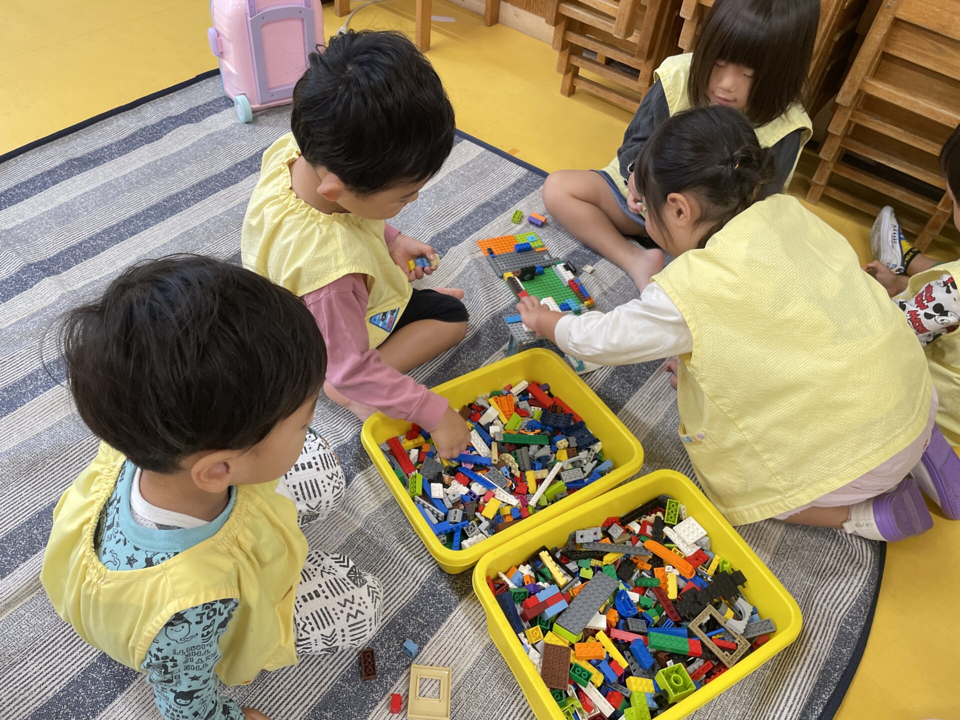 ブロックコーナーでは、数人で協力して1つの家づくりをしました。「ここにドアをつけよう」などと相談し、2階建ての家が完成です♪