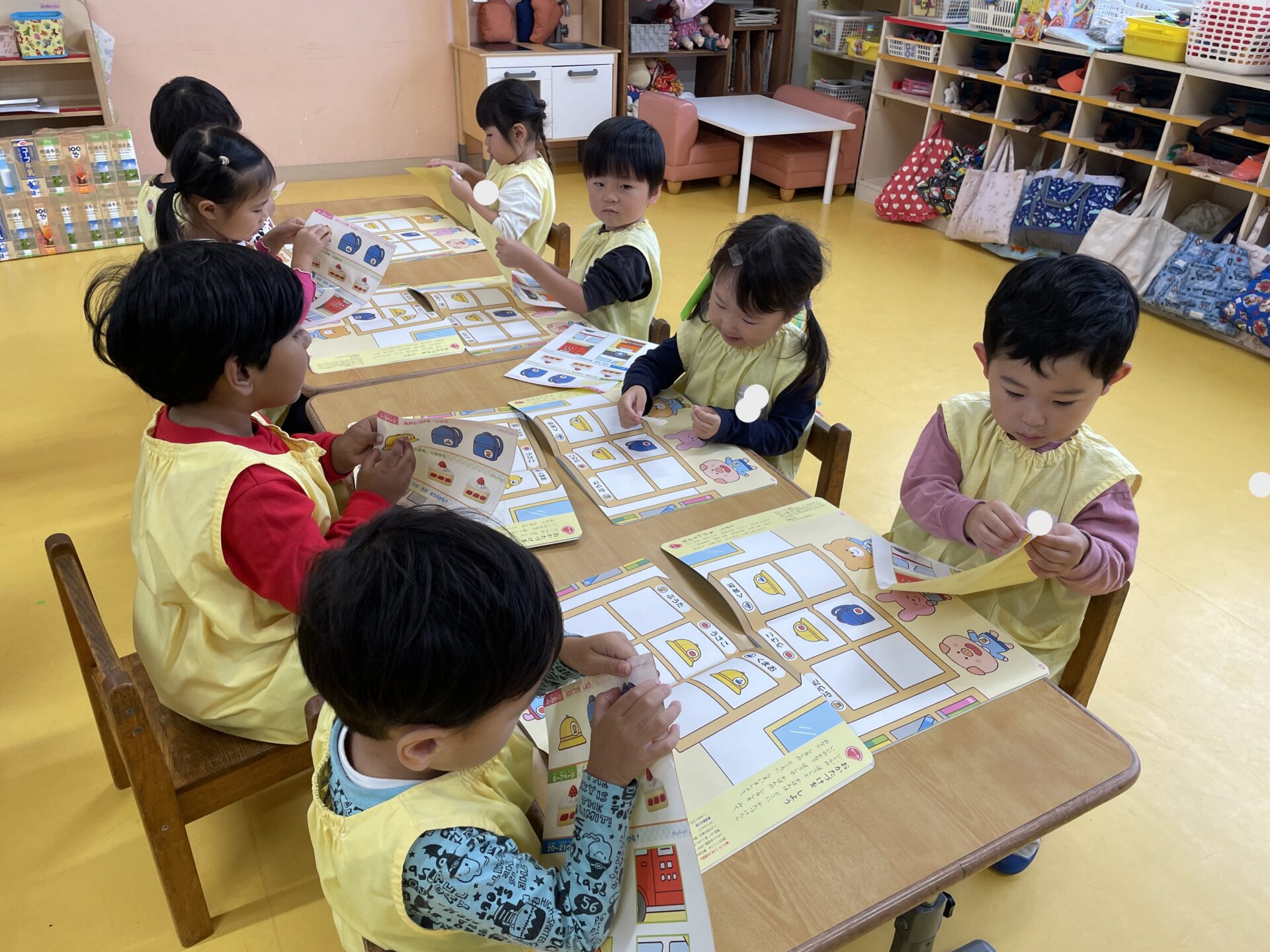 「たのしいワーク」を行いました。ケーキを1つずつお皿に配る・イラストを貼って働く自動車を完成させるなど、シールを使ったワークを行うと「できた!」と自信をもって知らせてくれる子どもの姿が見られました★