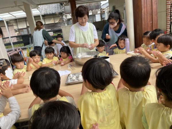 今日は「月見団子づくり」をしました。丸い形にするために、力加減も考え、手のひらを使って丸い団子を作ることができました。 ホールで鬼ごっこをしたり、スポフェスごっこで遊戯を行ったり、今日もたくさん体を動かして過ごしました★