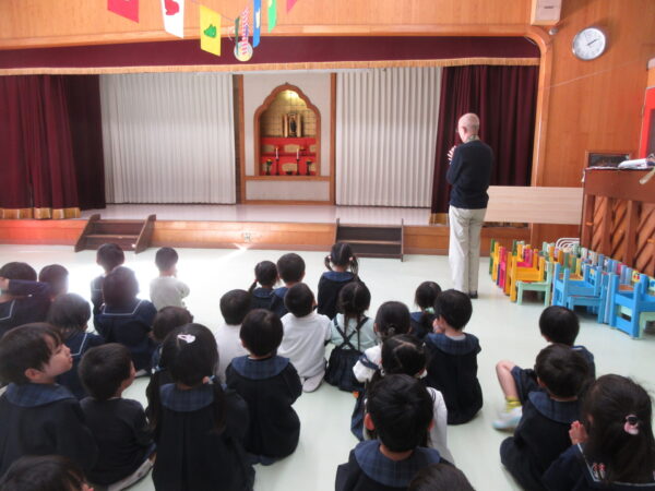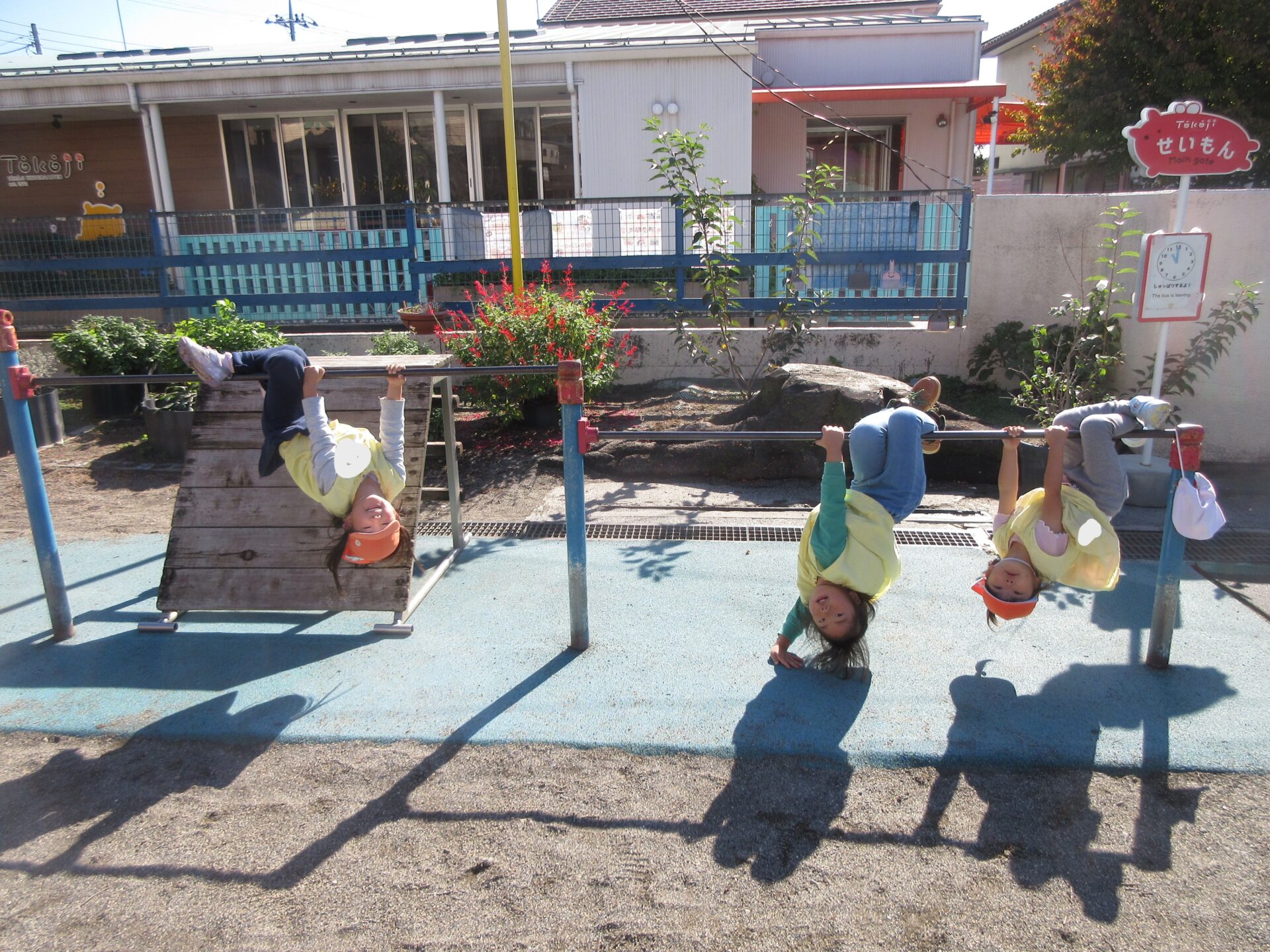 戸外では鉄棒に挑戦する姿が少しずつ増えてきました。足をかけて・・・友だちの見様見まねで行ってみたらできた!という体験もあったようです。 手で鉄棒を掴んでと段々手や腕の力もついてきたように感じます。 午後は久しぶりに集会がありました。ののさまを拝んで園長先生からハロウィンのお話を聞きました。今週の金曜日がハロウィンなので、飾りを作ったりして楽しめたらと思います。