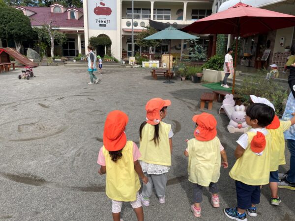 保育者が大きな絵を園庭に描くと「これはなにかな?」と興味津々でした。大きな「アンパンマン」の完成です。