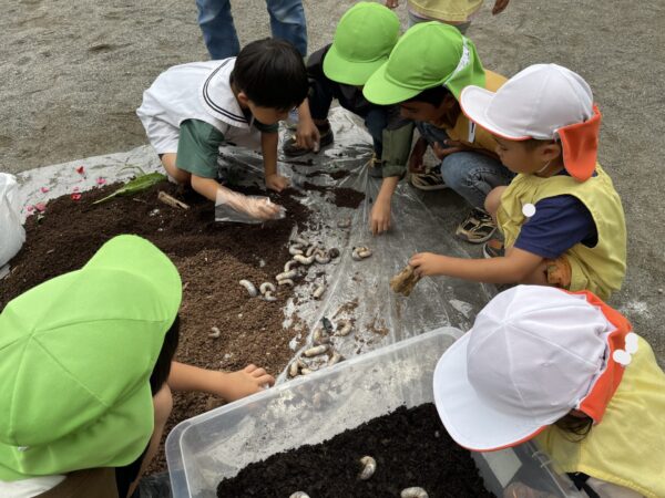 カブトムシが卵を産んで、しばらく経ち飼育ケースを覗いてみると糞がたくさんあることに気が付き、土を変えるとたくさんの幼虫が出てきました。みんな興味津々で覗いてみていました。