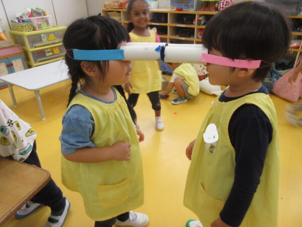 室内ではアートコーナーで双眼鏡づくりが大盛り上がりでした。登園するとすぐに取り掛かり、準備をしていました。出来上がると友だちと一緒に覗いたり、セロファンを通して見える様子が面白かったようです。