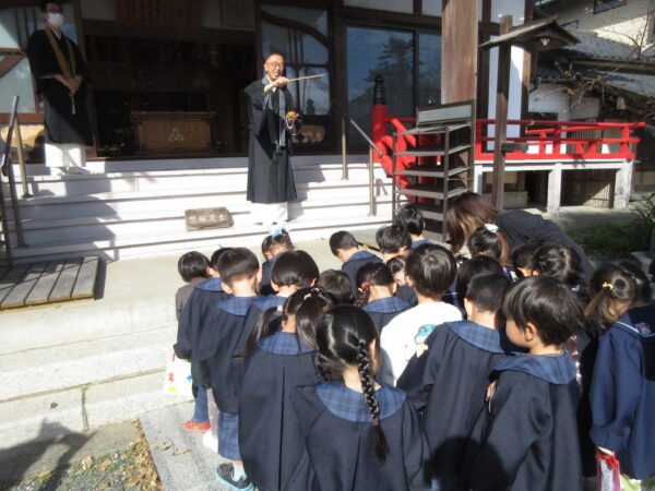 理事長先生からの七五三について話をしてもらい、千歳飴をもらって喜びました。