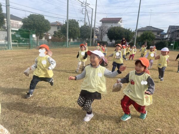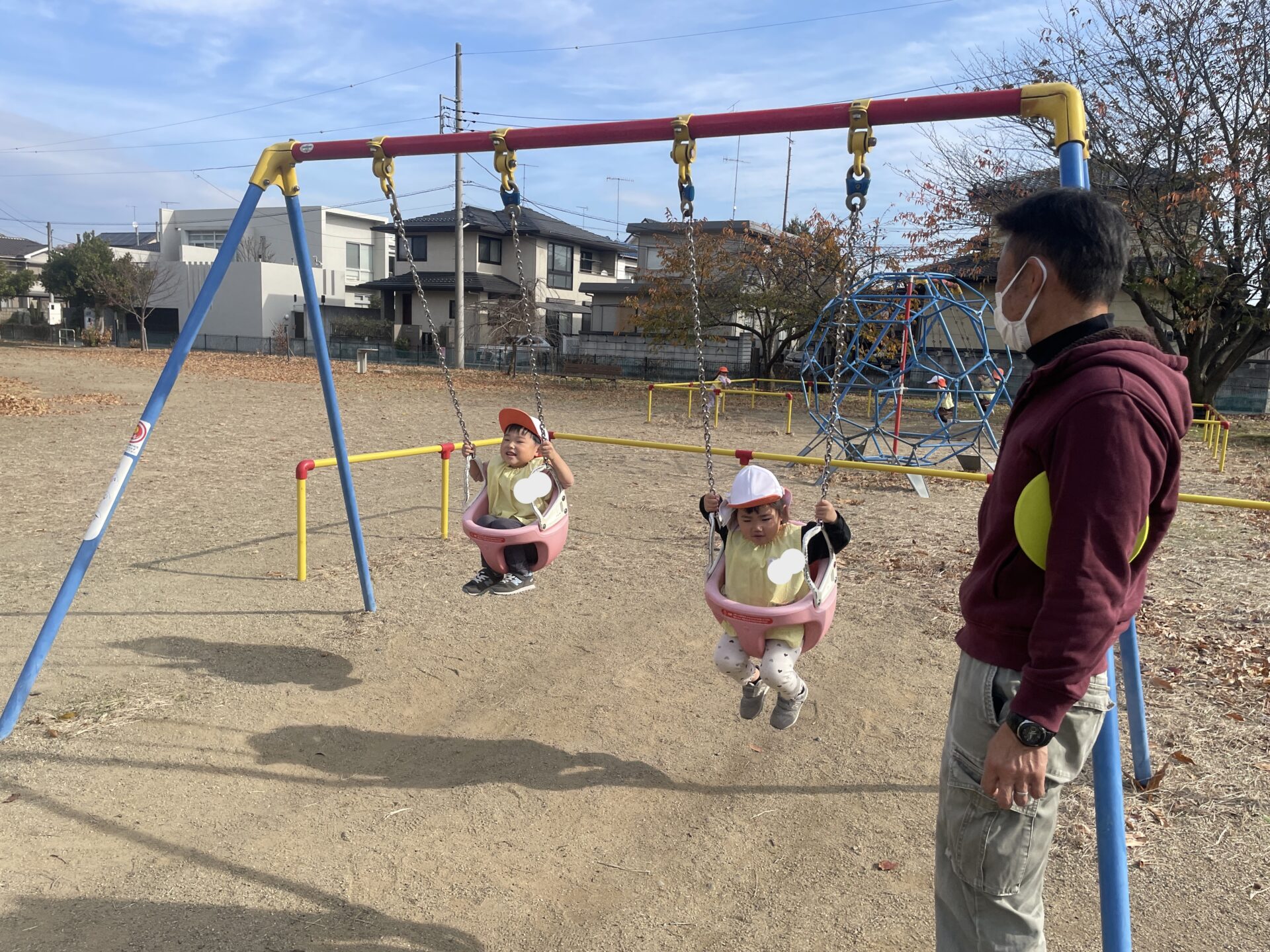 今日は園外保育で八幡公園に行きました。 「あと2回寝たら遠足だね」とずっと楽しみにしていたので、登園した時からウキウキドキドキの子どもたちでした。 公園に到着すると、どんぐり拾い・みんなで鬼ごっこや鉄棒・ブランコなどの遊具を楽しみました♪ レジャーシートを敷いて外で食べるお弁当もおいしいですね★