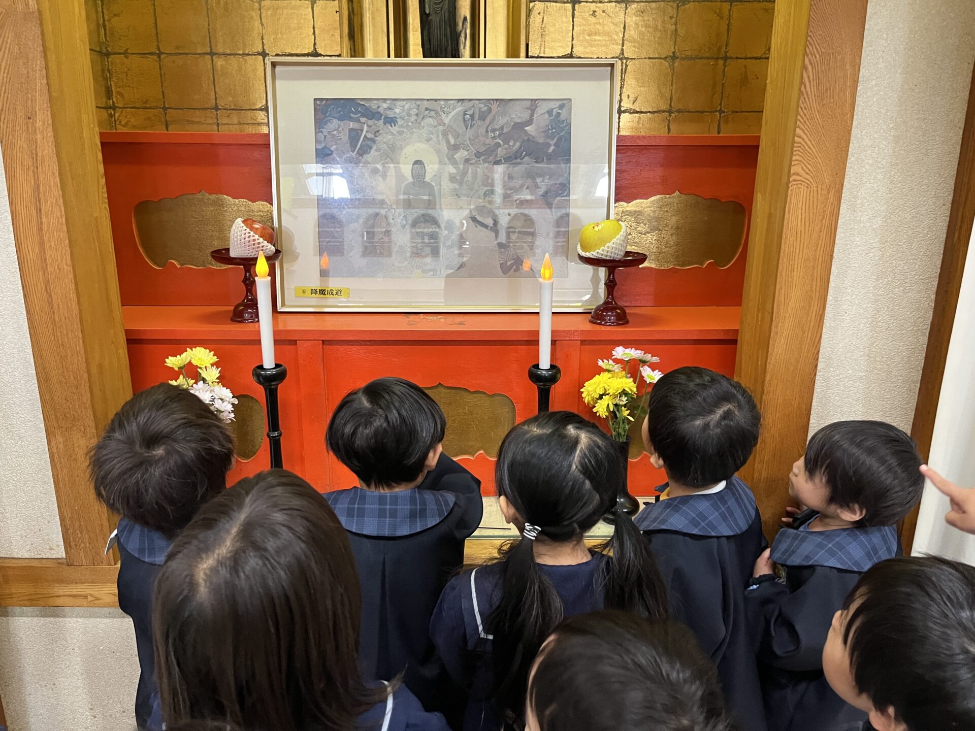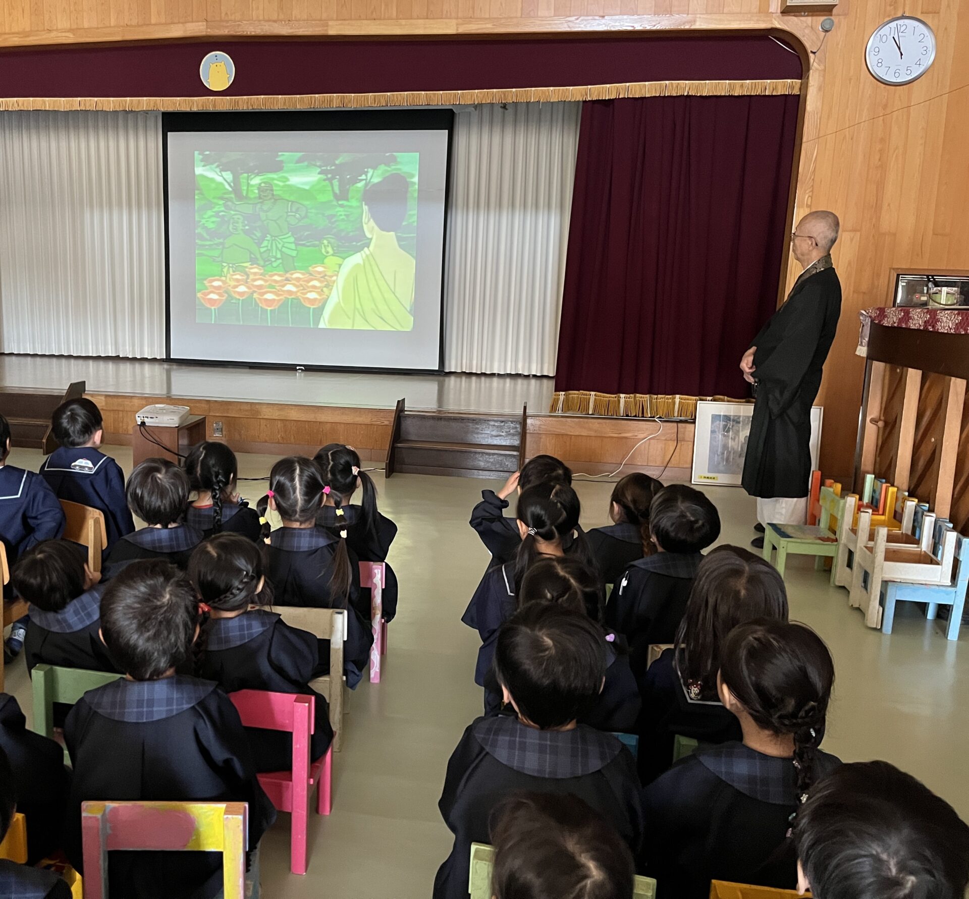 成道会集会に参加しました。 お釈迦様が悟りを開いた日で、映画を見たり、みんなで歌を歌ってお祝いしました。 悪魔が出てくる映画だったので、少し怖かったねとい話をする子もいましたが、ののさまが悟りを開いた様子の絵を真剣に見たりしていました。