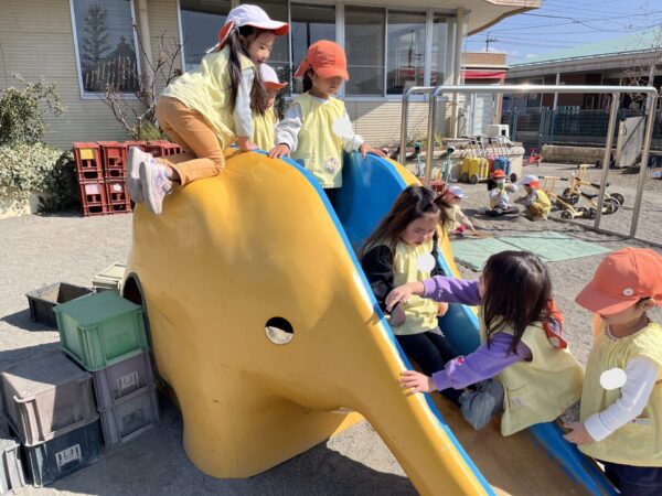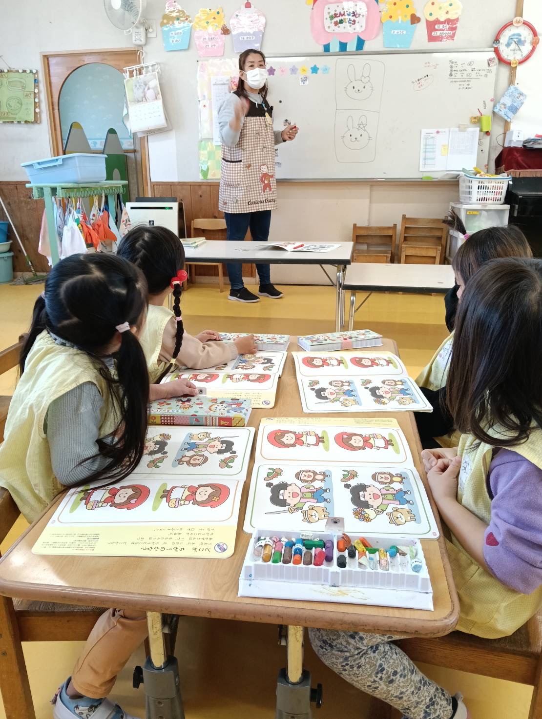 たのしいワークに挑戦です。保育者の話を聞いて、間違い探しや仲間分けを行います。 「色が違う」「持っているものが違う!」など発見したときには嬉しそうに、保育者や友だちに知らせ、喜びを共有しました。また間違い探しやってみたい!という声が多く聞こえてきました。