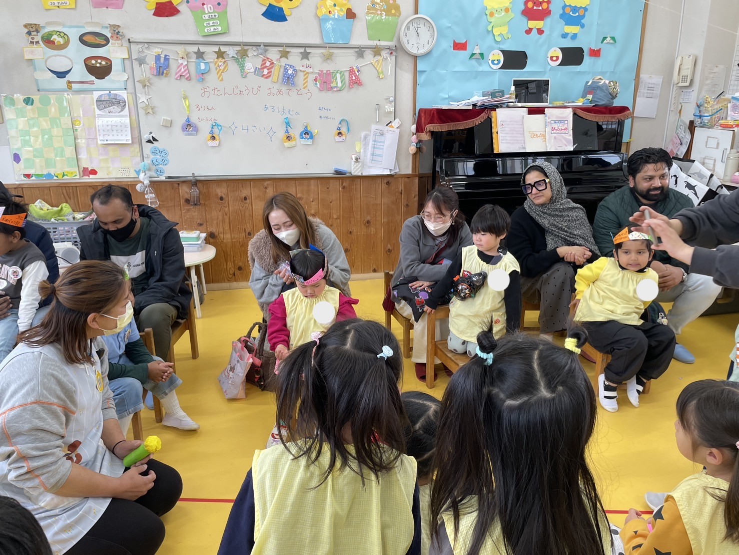 2月生まれの誕生会を行いました。好きな食べ物や動物、お気に入りのおもちゃを見せてもらい、お家の方ともたくさん交流でき、とても楽しい時間を過ごすことが出来ました。3月生まれの友だちも、次は自分の番だ!と首を長くして楽しみにしています。