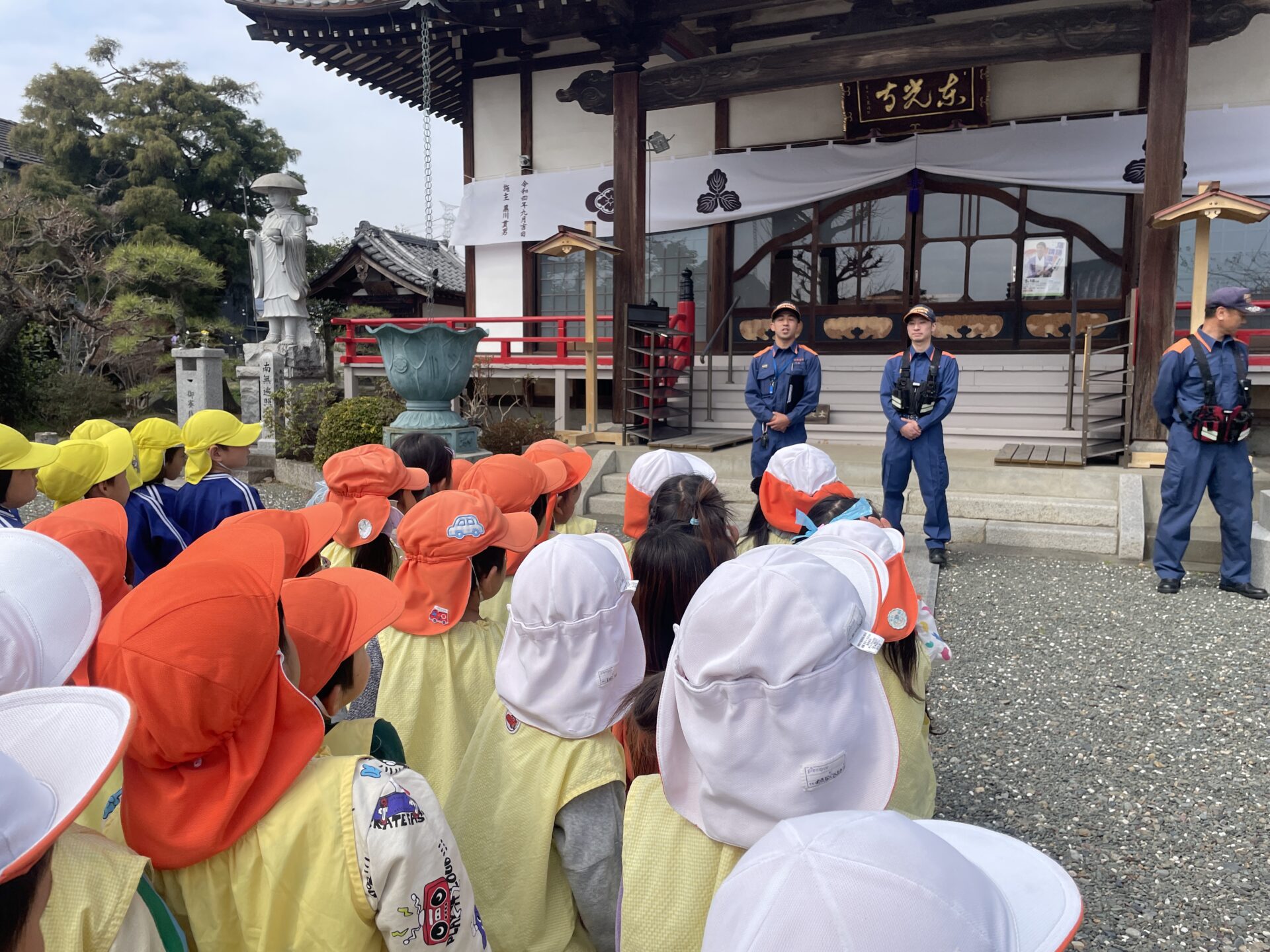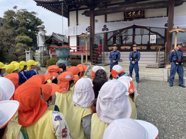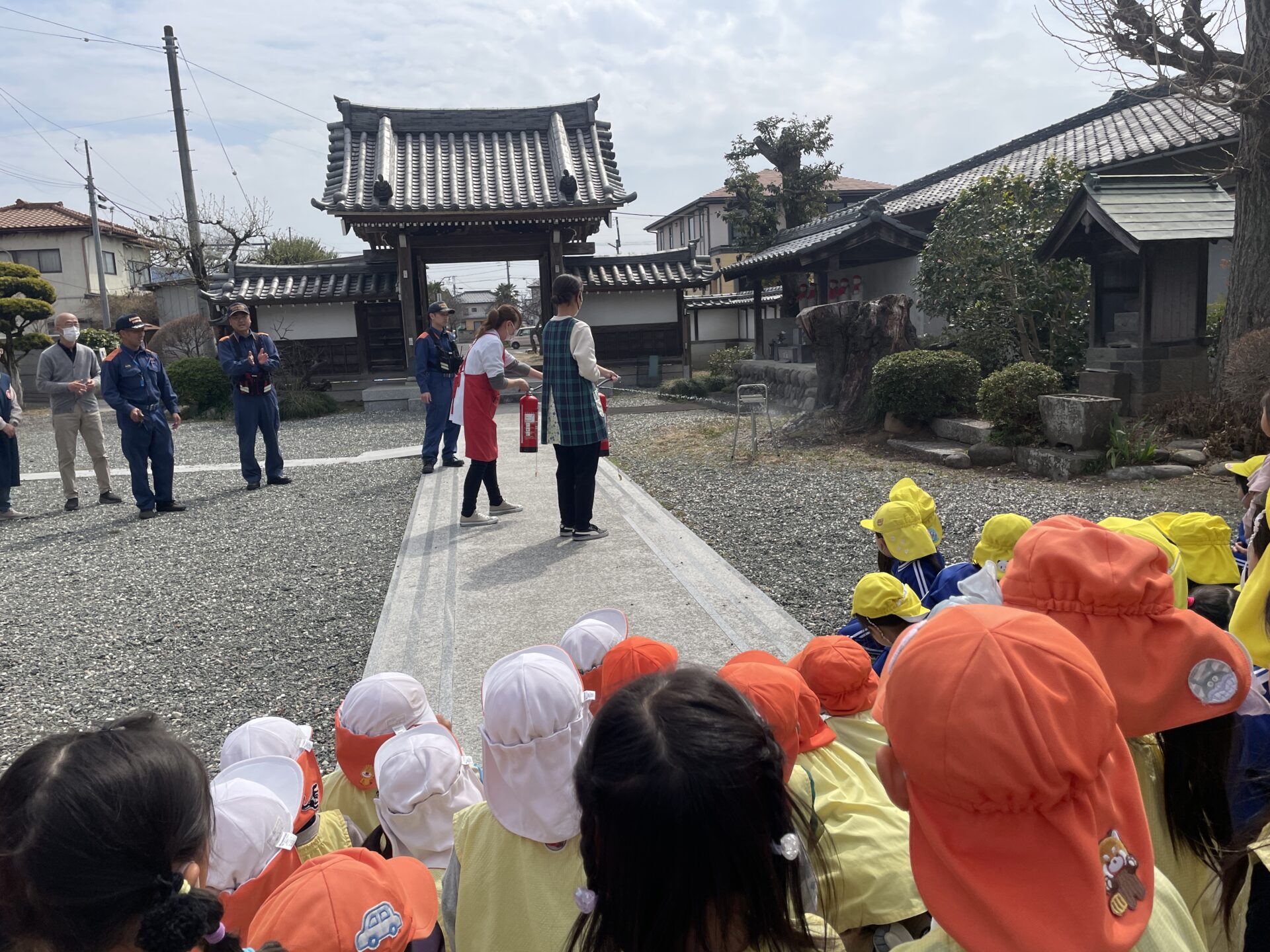 今日は今年度最後の避難訓練(火災)がありました。 ベルの音がすると、すぐに保育者のそばに集まり、ハンカチで口を押え、避難することができました。消火訓練も見学し、先生たちに「がんばれ」と応援する姿が見られました。
