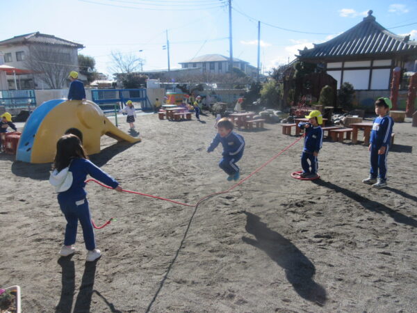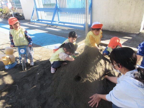 今日は、園庭で大縄跳びや、鬼ごっこをしながら寒さにも負けず、元気いっぱい体を動かして遊びました。砂場では、みんなで力を合わせて山を作り、お友だちと先生の手がつながるかな?とわくわくしながら穴を掘っている姿もありました。