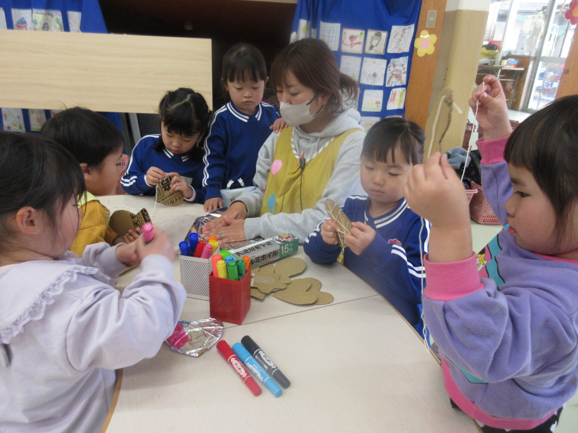 室内では、星や、ハート、魚の形に切った段ボールに糸を巻いていき、その上にアルミホイルを巻き、きれいに色を塗っていく遊びに夢中になっていました。出来上がったものにひもをつけてミニバックのように身に付けている様子も見られました。