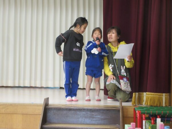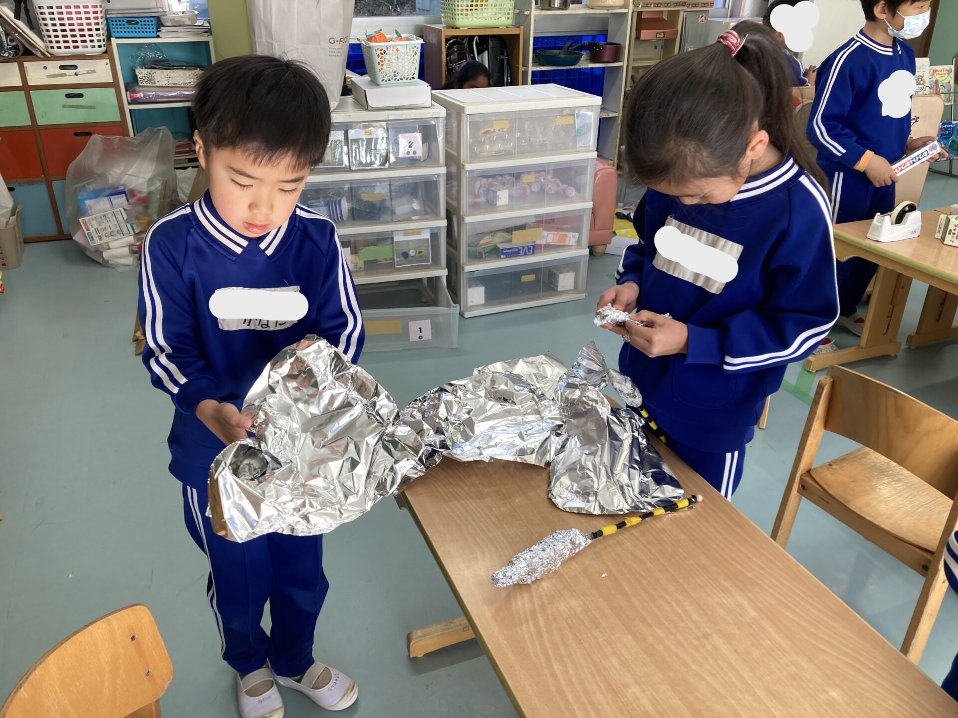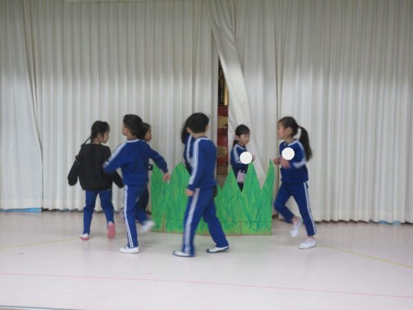 今週は、みんなで歌いながら踊りを踊ったり、一人ひとり、自分のセリフを知っていく時間となりました。 少し緊張しながら恥ずかしそうに話す子もいれば、感情をこめてセリフを言う子など様々でした。友だちの姿に刺激を受けながら、『もっと元気に行ってみようかな?』『悲しそうに話してみよう。』など考えている子もいました。 自分たちで小道具のつづきを作ったり、実際に劇で使い始めている子どもたちです! 来週は、大物にもみんなで取り掛かり始めようと思っています♪