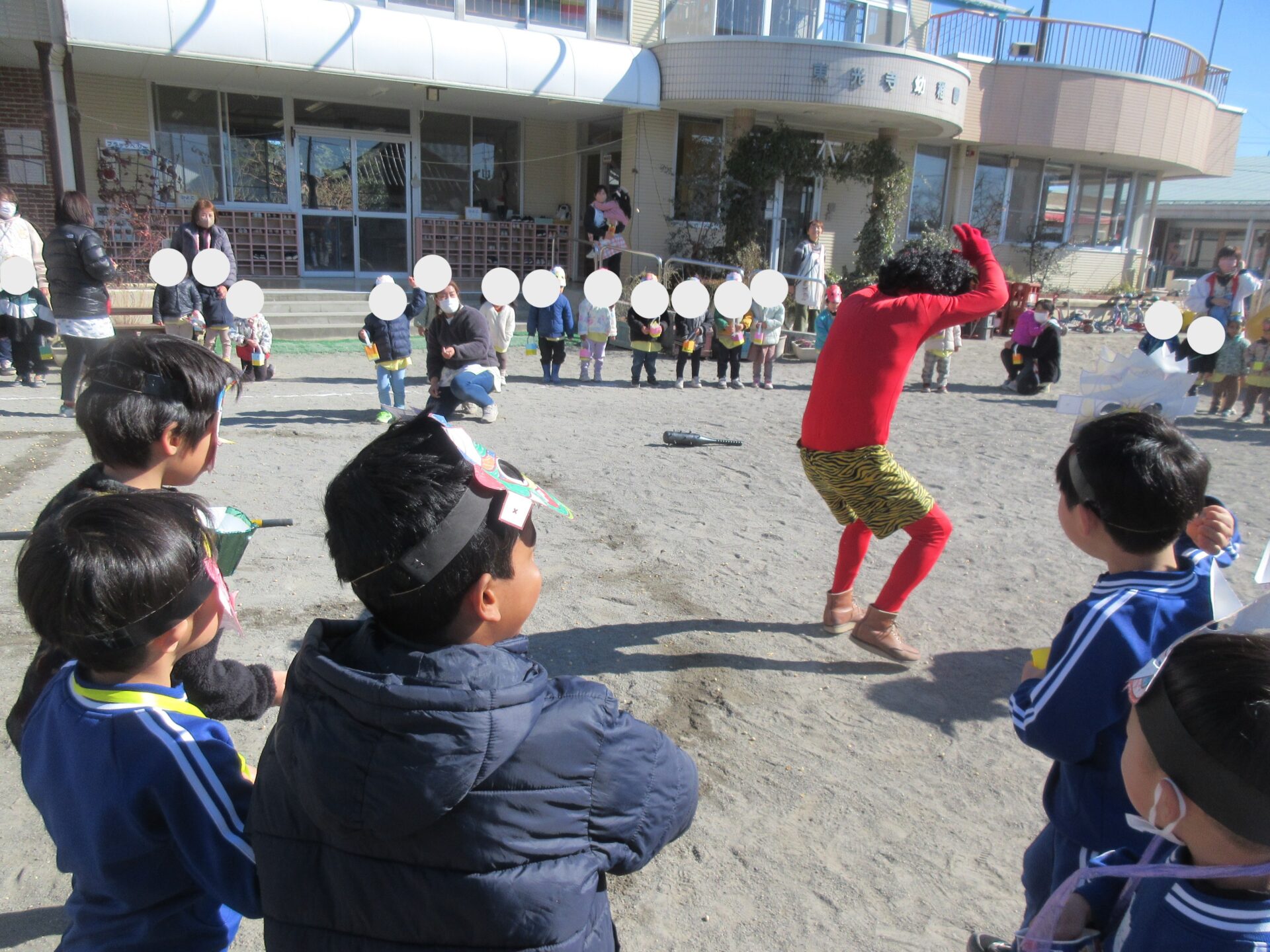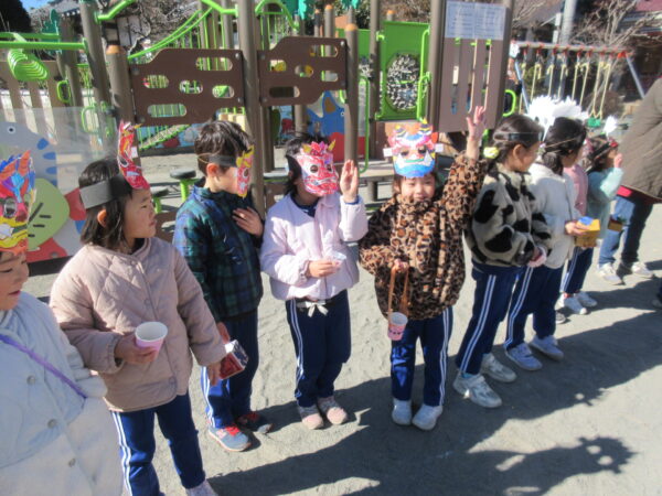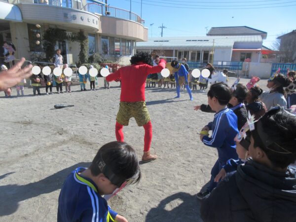 今日は、豆まきをしました。 みんな、『○○鬼をやっつける!』と、意気込んでいました! 鬼が出て来ると少し圧倒されている様子もありましたが、他学年が豆を投げている時には応援をしたり盛り上げてくれていました。 自分たちの番が来ると、真剣に掛け声とともに投げていた子どもたち。 みんな鬼の近くに行って一生懸命に参加していました! 最後には、優しくなった鬼と写真撮影!仲良しに慣れて良かったですね。