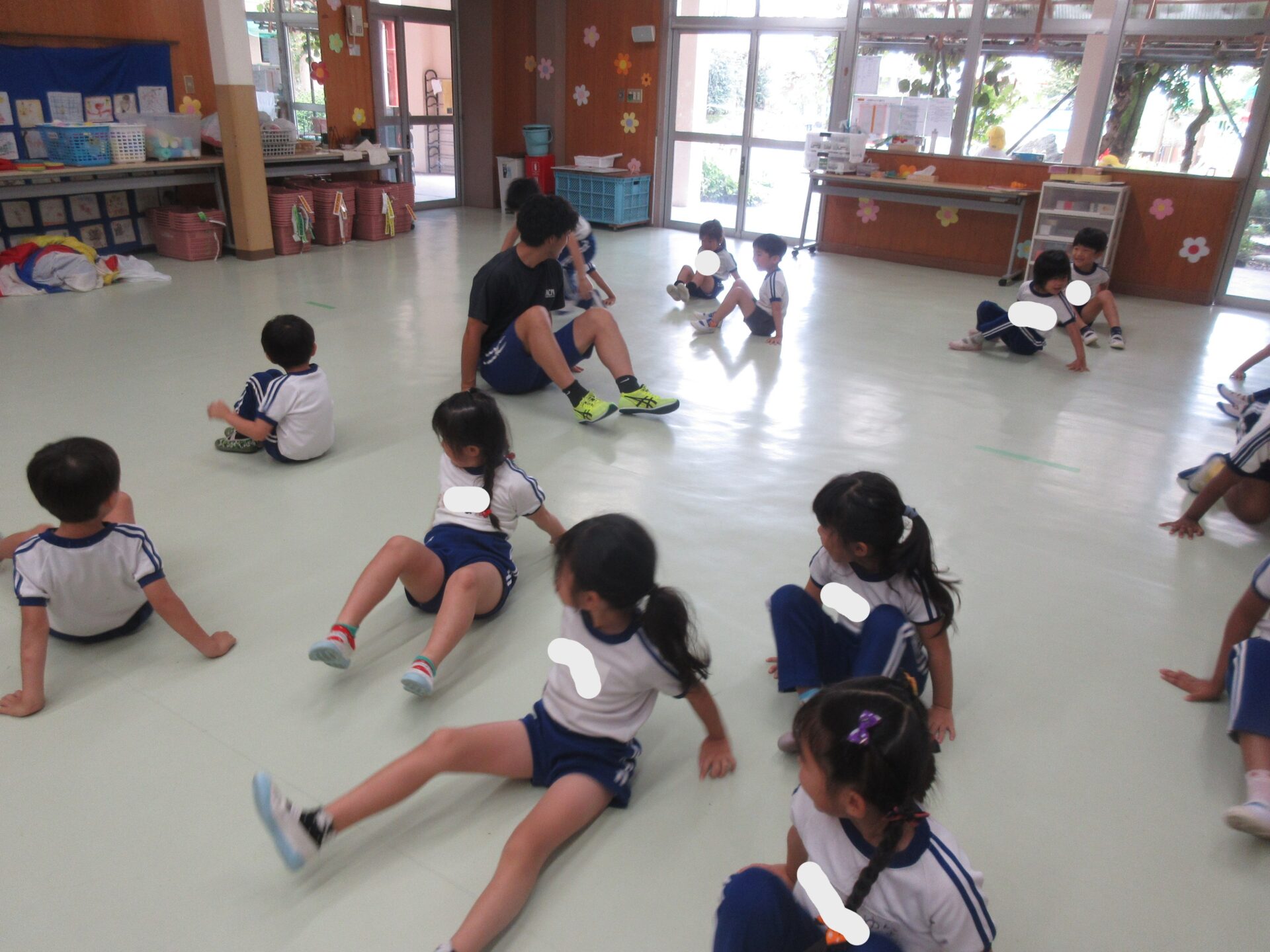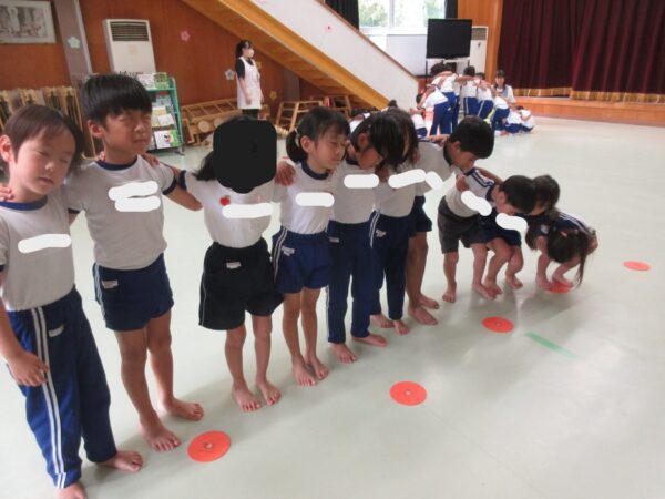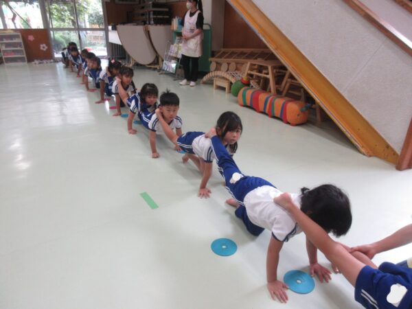 今日は、体育教室がありました。自分の場所も繰り返し行う中で少しずつ覚えてきた子どもたち。徐々に自身もつけて、頑張っています。馬になる子も途中で支える子も上に乗る子も誰がいなくても困ること、大切なんだよと言うことをみんなで話し、さらに前向きに取り組むことが出来ていました。頑張った後には、みんなでハリーポッターゲームをしました♪箱田先生魔法使いにつかまらないように、みんな真剣に逃げる姿が可愛らしかったです♡