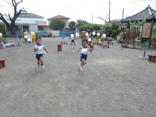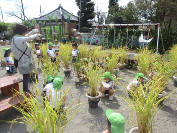 今日は、園庭でリレーごっこをしました。自分たちで順番を決めたり、みんなの楽しそうな姿を見て「やりた~い!」とたくさんの子が加わってくれました。頑張れ~!の元気な応援もたくさん聞こえてきましたよ。 昼食前には、稲刈りもしました。自分のハサミで一生懸命切って輪ゴムでまとめました。高さをそろえてまとめたり、輪ゴムで縛ることが難しい部分もありましたが、頑張って行っていましたよ。これから、ホールの前で乾かしていきたいと思います!