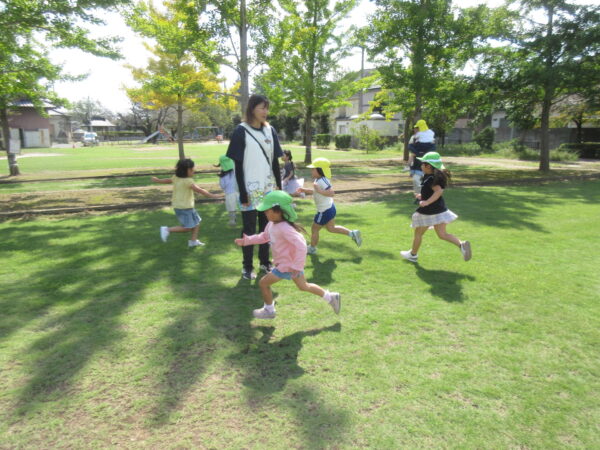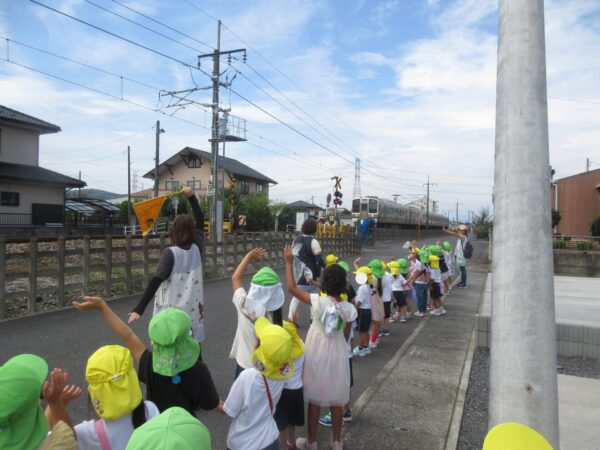 今日は、もも組さんと一緒に篠生神社まで散歩に行ってきました。 着いてすぐに、みんなで鬼ごっこをしました。心地よい気候だったので、みんなで走り回って体を存分に動かしてとても気持ちが良かったですよ。また、篠生神社の中ではたくさんのセミの抜け殻を見つけたり、キノコを発見してみんなに教えてくれている子もいました。 行きと帰り道では、2階も電車にすれ違い、汽笛を鳴らしてもらい、たくさん手を振って大喜びの子どもたちでした♪