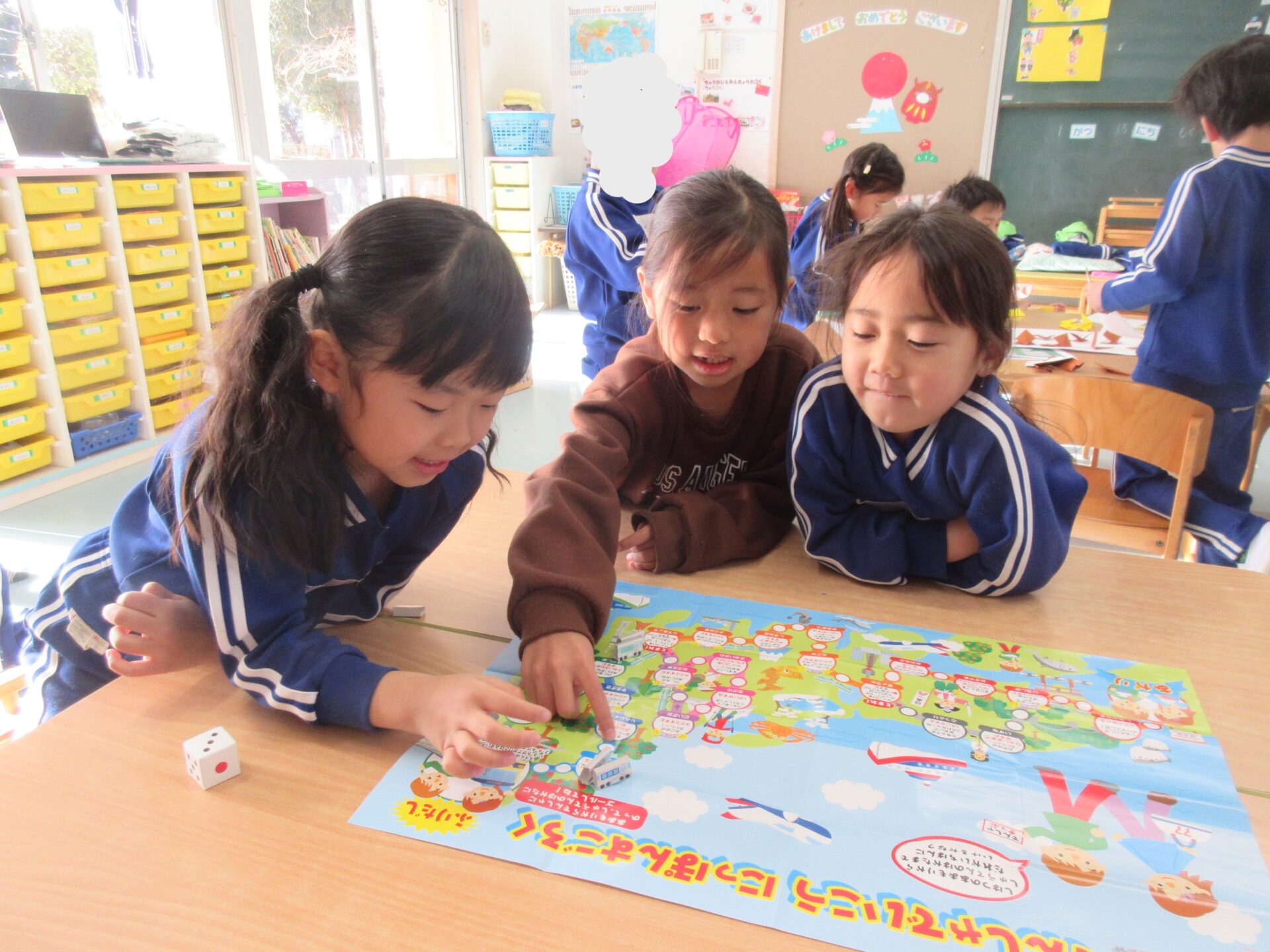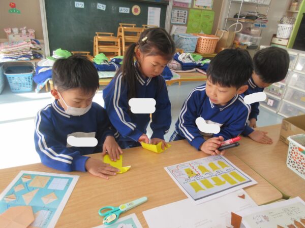 今日は、素材の中からカプセルを見つけると、「劇遊びの柿を作るのにピッタリかも!」と発見した子がいました。周囲の子も同じ思いで意見を出し合いながら、夢中で作っていましたよ。 折り紙も細かい折り方のものにも積極的に挑戦したい子が多く、難しい時には友だちと確認したり教え合いながら作っていました。 お正月遊びも盛り上がり、すごろくを楽しんでいます。 一回休み、3マス進む、2マス戻るなど嬉しさや悔しさを感じながら、繰り返し遊んでいました♪