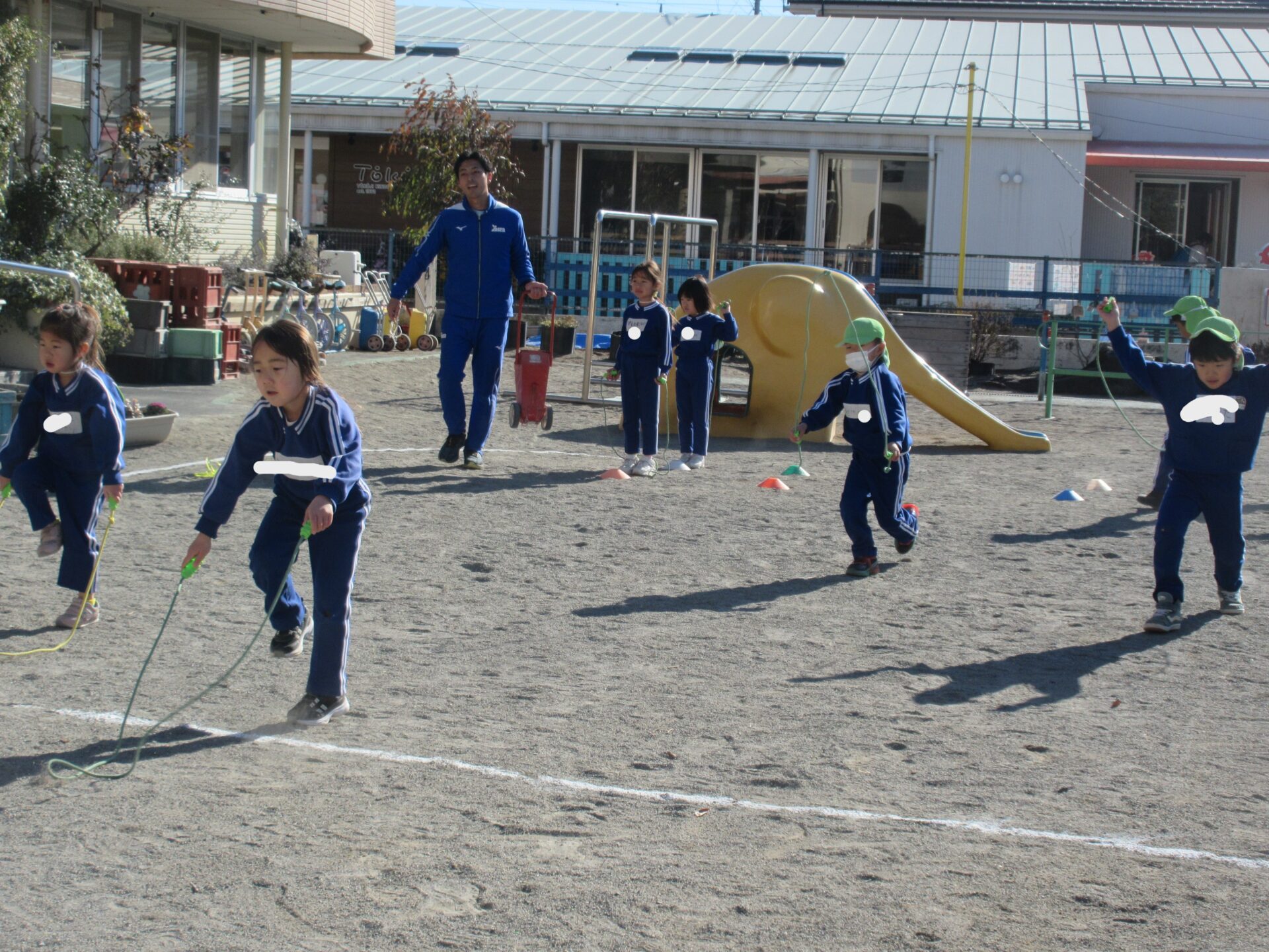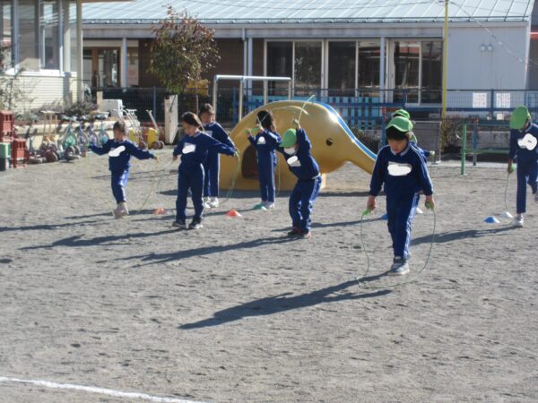 今日は、3学期初めての体育教室でした。昨年から縄跳びや大縄跳びに興味を持っている子が多かったので、楽しみにしていました。縄を回しながら歩いたり、走ったり、前跳びをしたり。縄を大きく回すコツを知って、楽しみながら取り組んでいましたよ。体育教室が終わった後も、縄跳びで遊んでいる子が多かったです。
