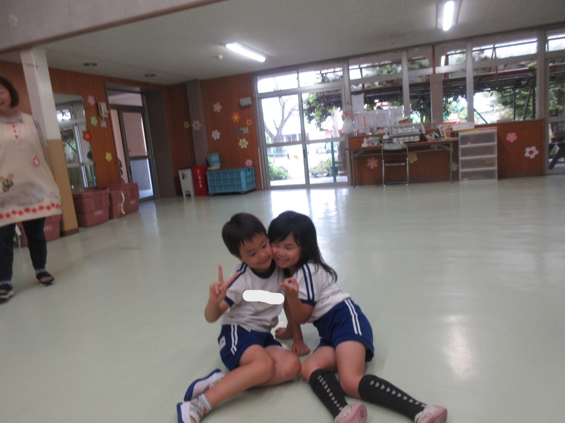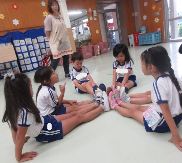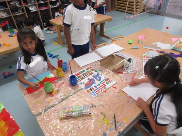 今日は、クラスの中でも万国旗づくりが盛り上がっていました。『インドネシアがいいな~。』『私は日本!』国旗のイラストを見ながら、友だちと相談して決めている子もいましたよ。色々な国旗が出来上がりとてもカラフルです♪ ホールでは、忍者体操をしたり、人数集めゲームをしたり、リレーごっこを楽しみました。色々な友だちとのやり取りも盛んで、積極的に声をかけながらかかわっている姿が印象的でした!様々な子と話をして関わることで、友だちのよさにもたくさん気づくことが出来ますね♪