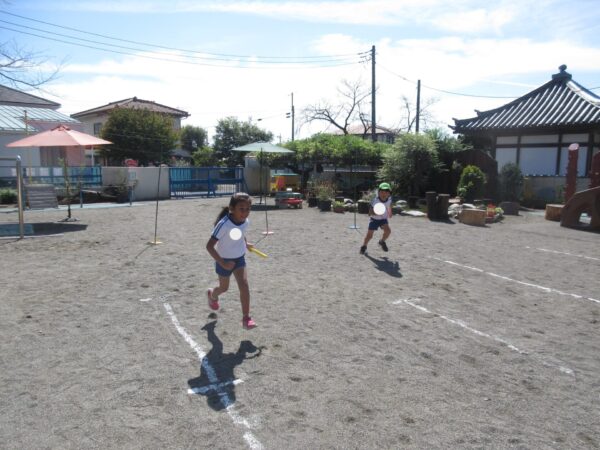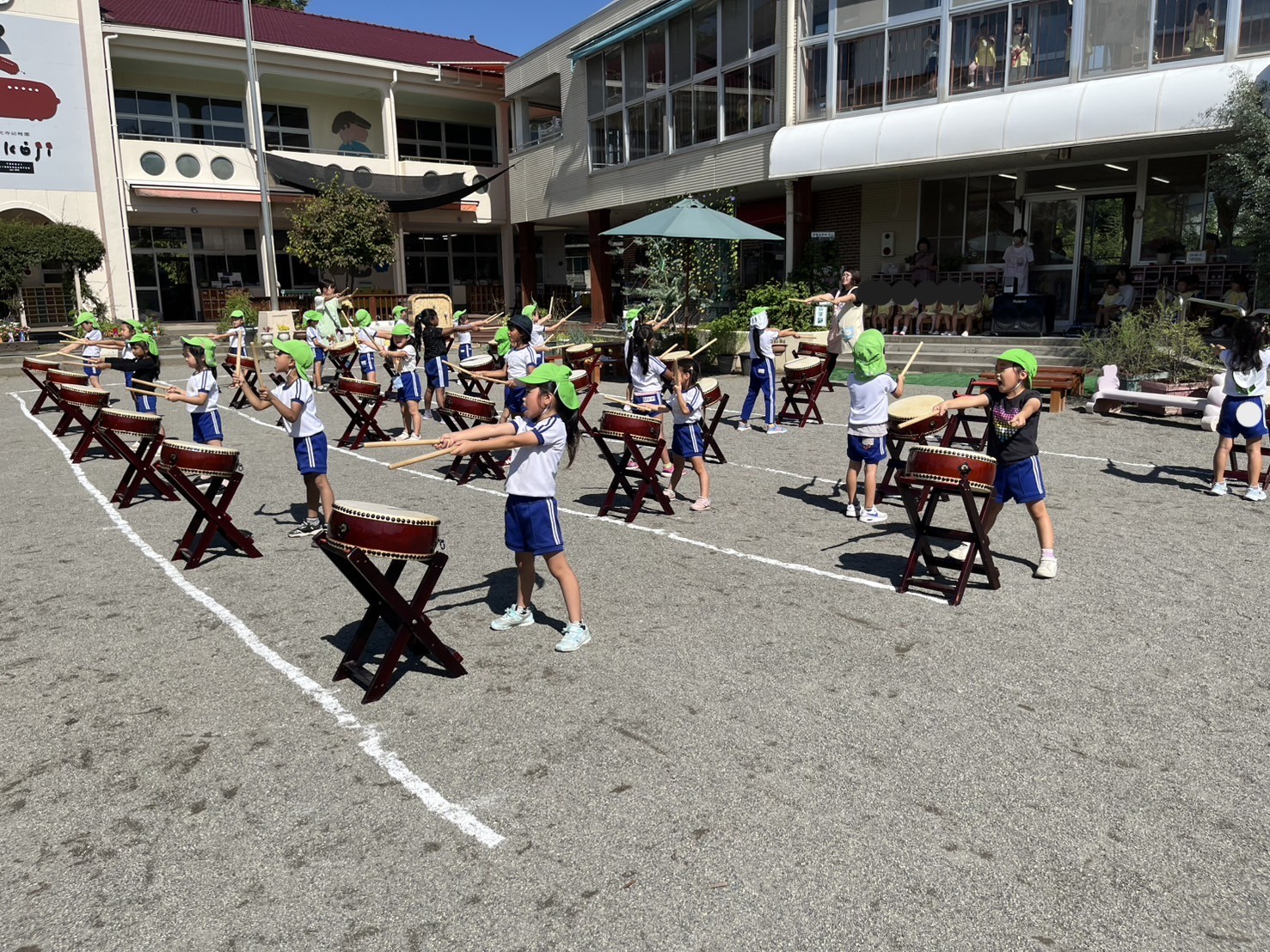 今日は、園庭で和太鼓とリレーをしました。みんなの応援もあって、いつも以上に頑張る姿が見られてかっこ良かったです。“1,2,3,4,5,ハッソーレ!”の掛け声がお気に入りで、みんなのパワーが感じられました。 リレーも行いました。どのチームも1位になりたくて、真剣です。今までよりも長い距離になったので、後半疲れが見える子もいましたが、たくさんの声援で最後まで頑張って走っていたふじ組さんでした♪