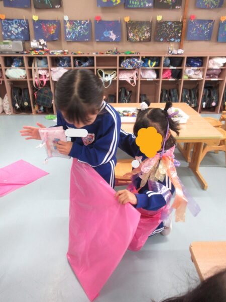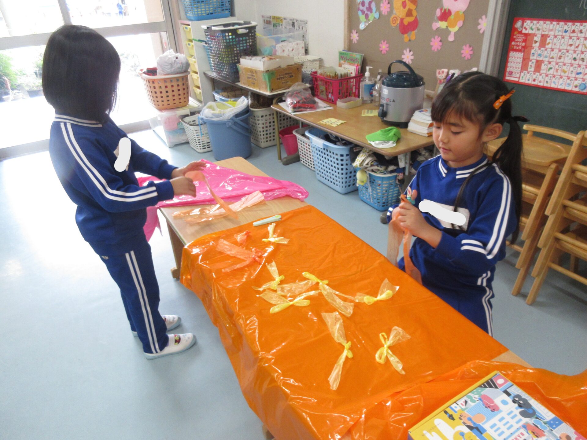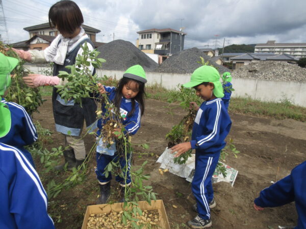 アートコーナーでは、カラーポリ袋やスズランテープを使っての衣装や小物づくりが盛り上がっています。友だち同士で大きさを合わせながらスカートにしたり、スズランテープで作ったリボンを装飾として付けるなど、子どもたちの工夫が光っていました。また、今日は、落花生の収穫に行きました。みんなで協力して抜いてみると、たくさんの落花生をつけていることに驚きと喜びを感じていましたよ!みんな、一粒一粒根から取ってくれていて、何よりも食べることを楽しみにしている様子でした♪