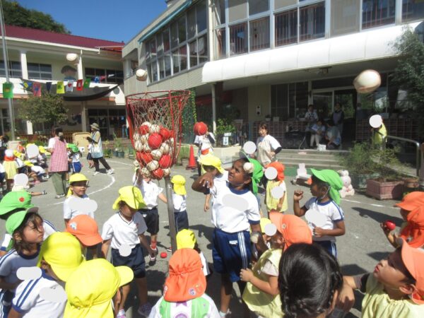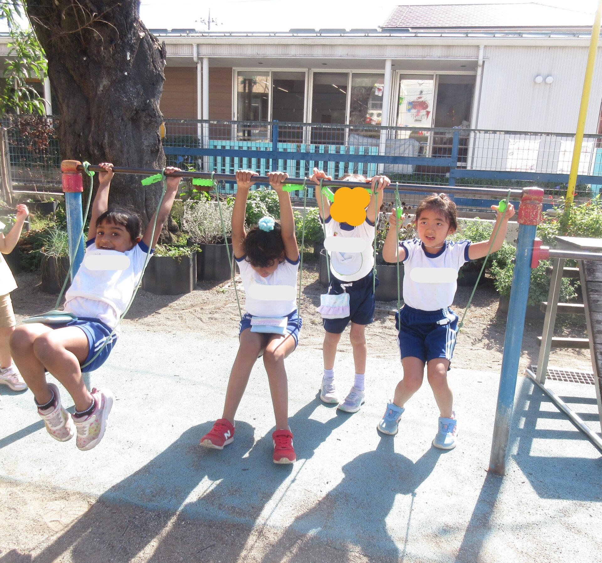 今日は、園庭で開会式ごっこをしたり、ひよこ、もも、ふじぐみで踊っているダンスを順番に行い、沢山体を動かしました。まねっこをしたり、自分の知っている踊りは、友だちに優しく教えてあげたり、やり取りも楽しみながら、元気に体を動かしていましたよ。 鉄棒では、縄跳びをぶら下げてブランコのようにしていました。みんなでそろってゆらゆら揺れるのが楽しくて気持ちよさそうでした♪