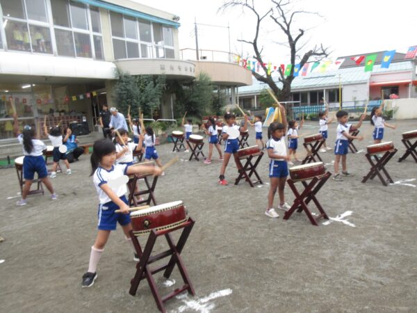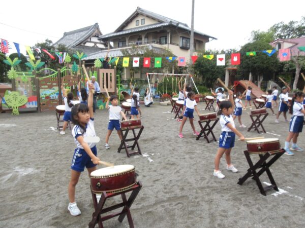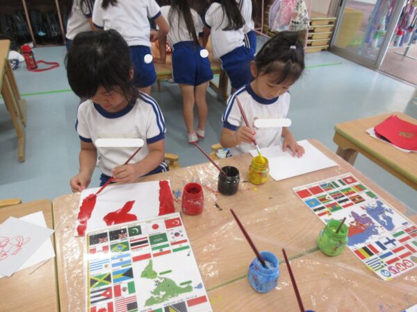 和太鼓がありました。みんな、リズムを覚えてたたけることが楽しい様子で、自信を持って参加していました。周囲からたくさん褒めてもらうことで、さらに自信がつき、掛け声やポーズにも力が入り、かっこよく決まっていましたよ! 室内では、万国旗づくりコーナーも引き続き盛り上がっています。色々な国の名前に触れながら、自分の好きな旗を選んで描いています♪