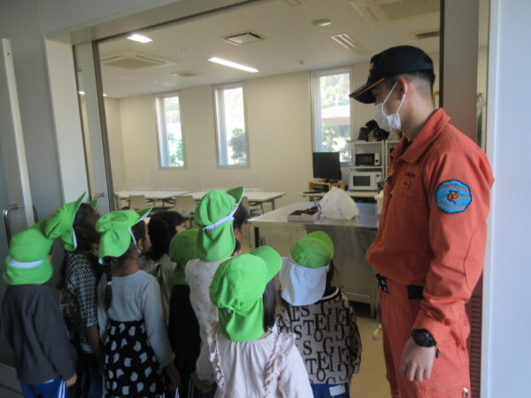 消防署の館内を見学させてもらい、色々な部屋を見ながら「自動販売機があるよ!」「お風呂の湯舟が2つある~。」など、気づいたことをたくさん言葉にしていました。
