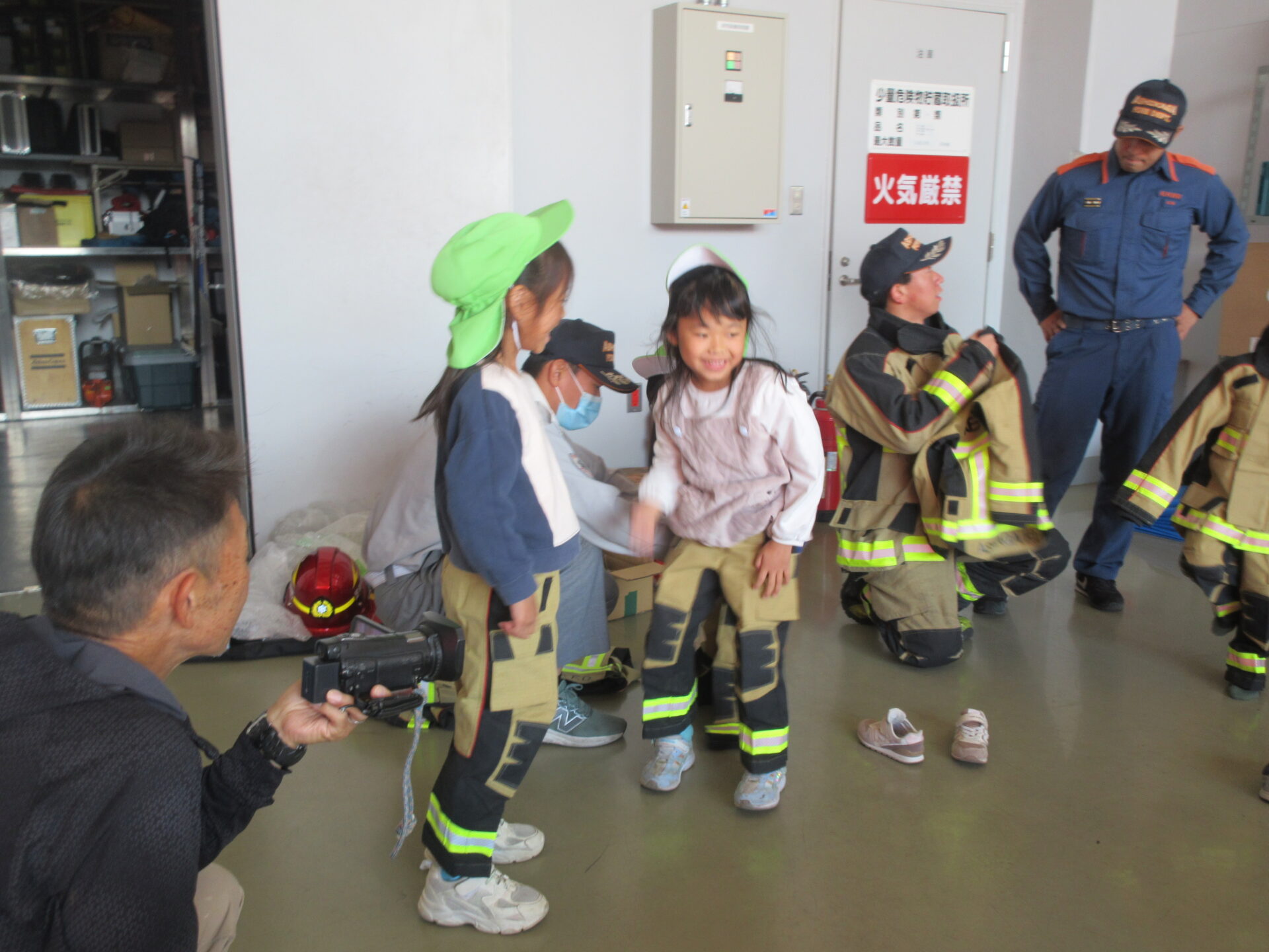 消防車や救急車の中も見せてもらい、その後は、出動時の服への着替えを見学したり、実際に子どもたちが消防服を着させてもらえる体験もありました。