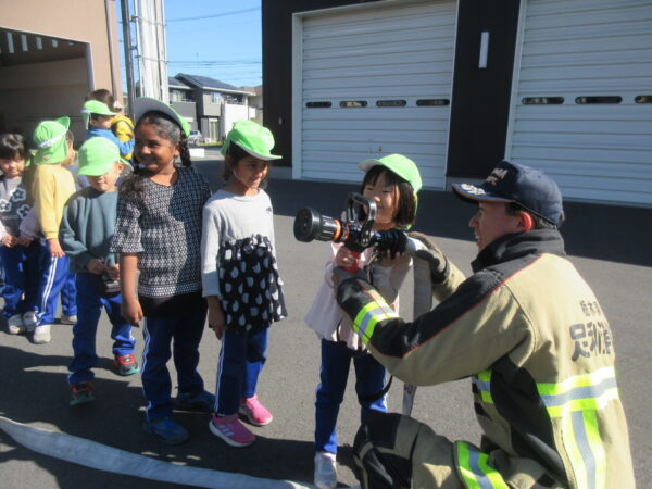 最後には、消火活動で使用するホースを持たせてもらい、思った以上の重さに驚いている子もいました。