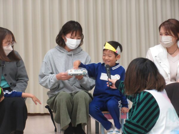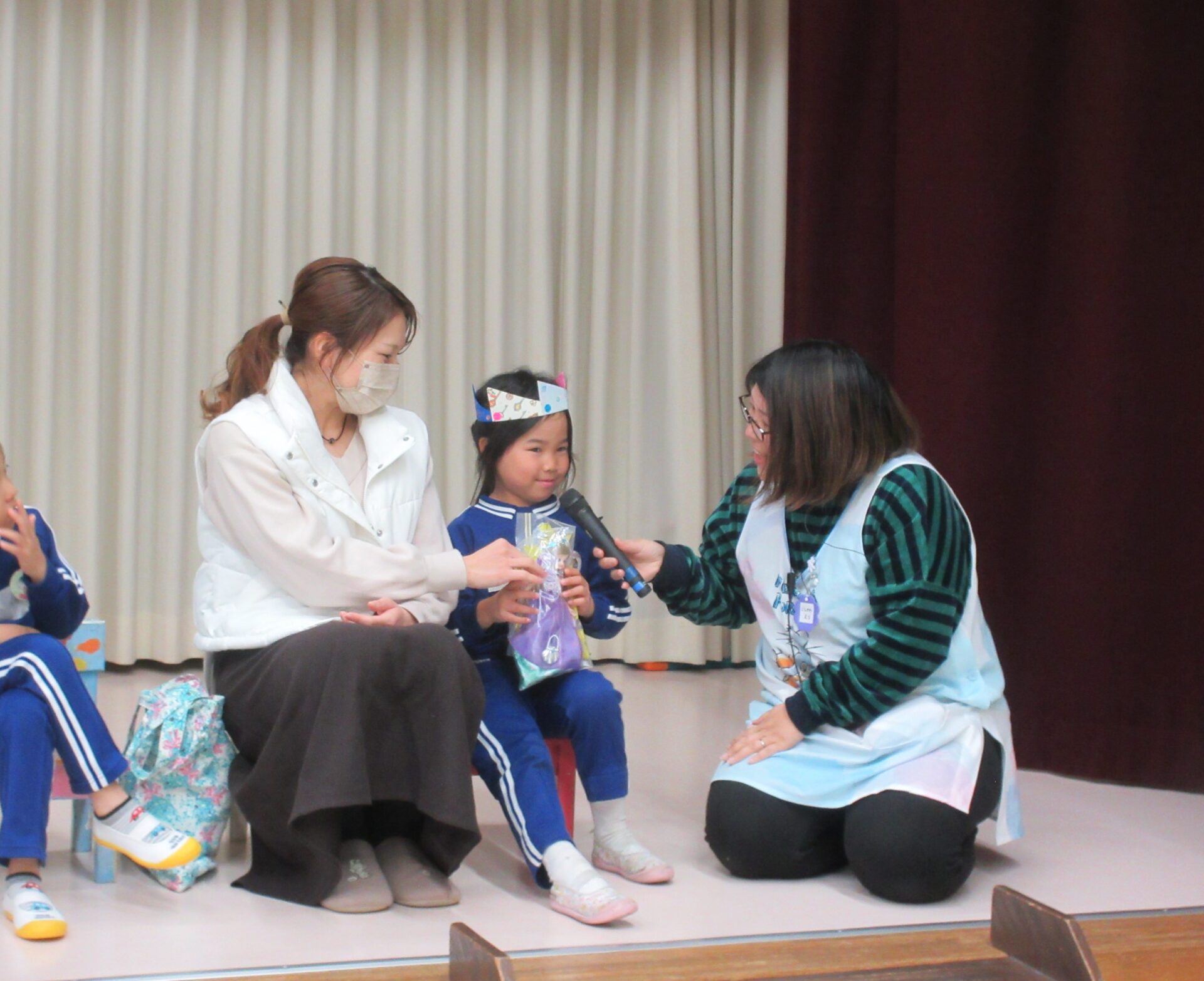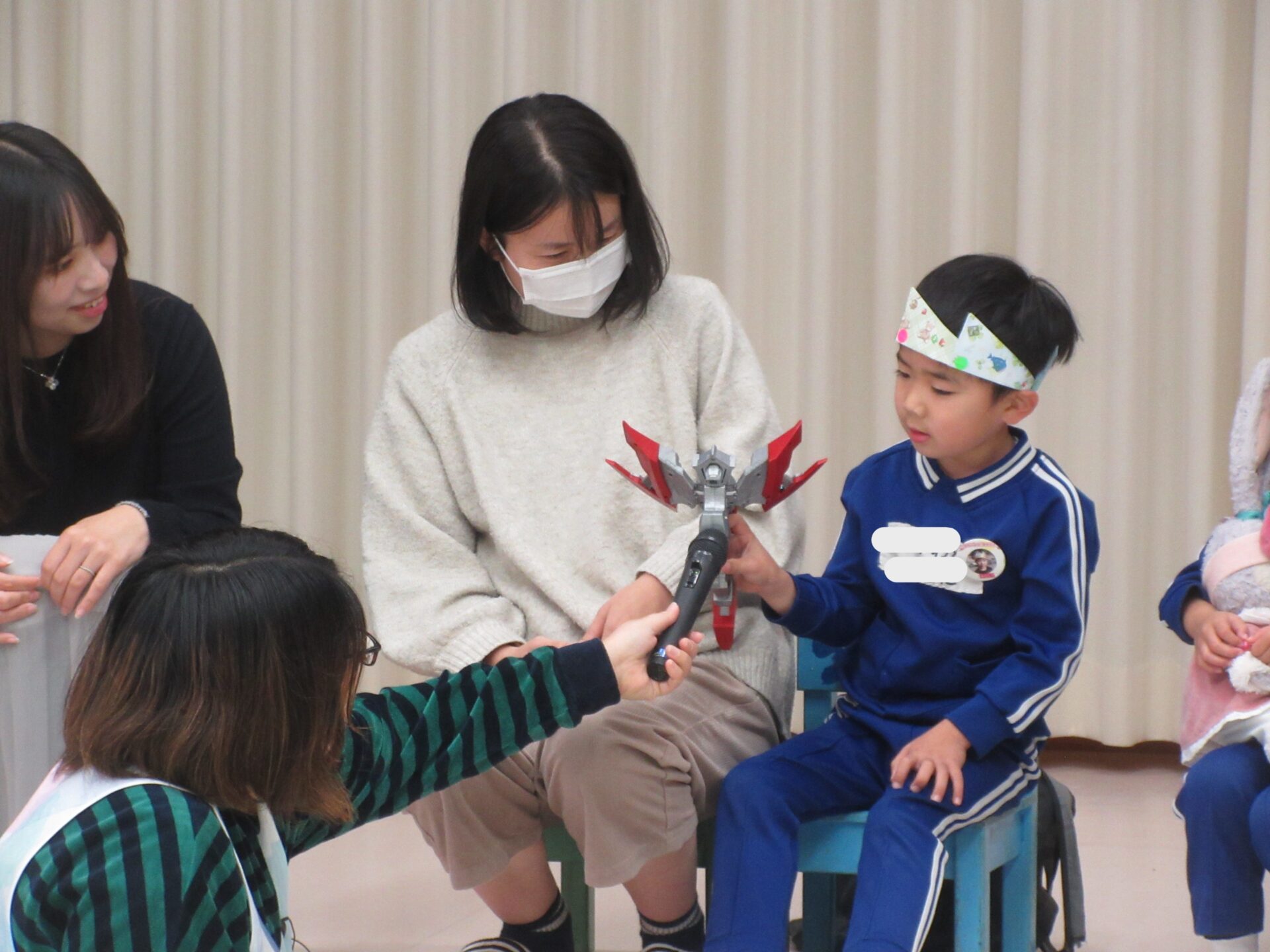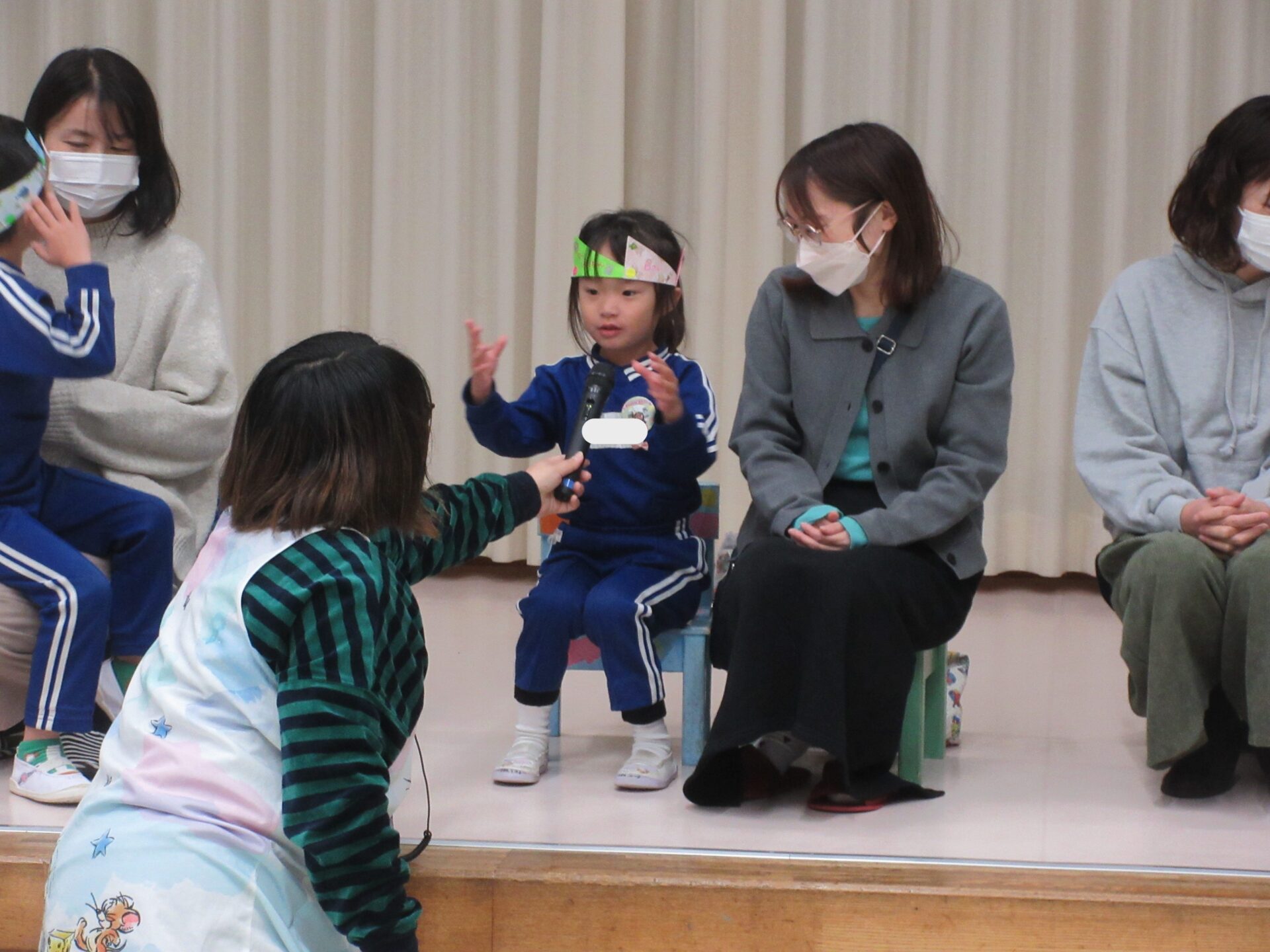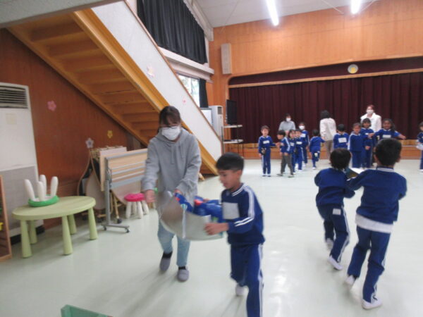 今日は11月生まれのお誕生会がありました。 何日も前からカウントダウンしながら楽しみにしている子も多く、宝物の紹介では色々なエピソードも教えてもらいました。ステージの上でドキドキしながらも、頑張ってお話もしてくれていましたよ。かっこ良かったです。 最後のお楽しみでは、みんなの大好きな猛獣狩りゲームや落とさないでボールをゴールまで運ぼうゲームをしました!落ちないよう友だちやお家の人と工夫しながら運ぶ姿や負けないように真剣に取り組む姿が印象的でした♪