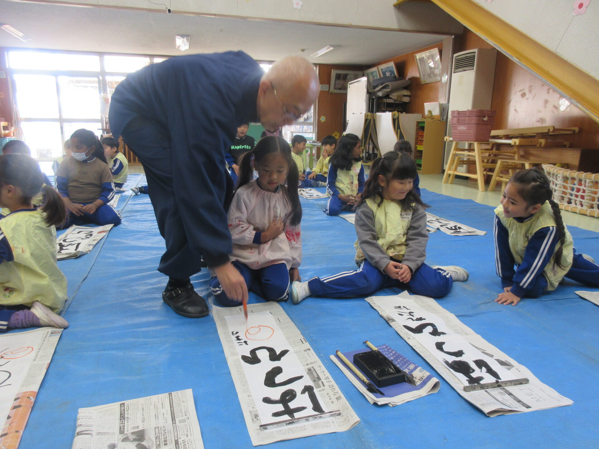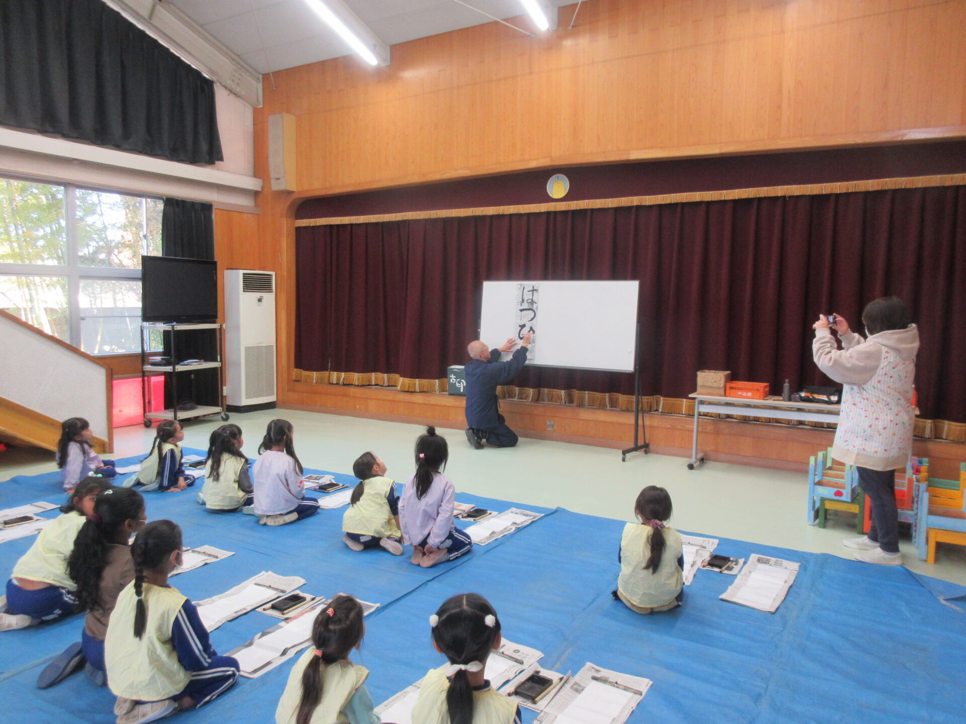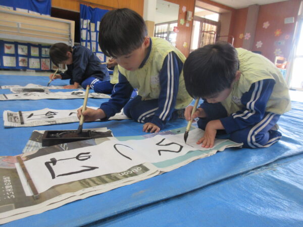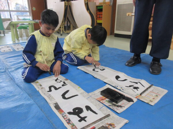 今日は、習字がありました。 書きぞめだったので、床に広げて書きましたが、姿勢、持ち方、理事長先生からの書くポイントを教えてもらいながら取り組みました。 【はつひ】の文字に挑戦し、「は」の丸くなるところが難しかったですが、力を抜いたり、手首を使いながら行なっていました。 繰り返し書くことで慣れてくると、自信を持って書き進めていた子どもたちです。 筆で書く感触を感じ、習字での大切なことを沢山教えてもらい、静かな気持ちでじっくり取り組む時間となりました♪
