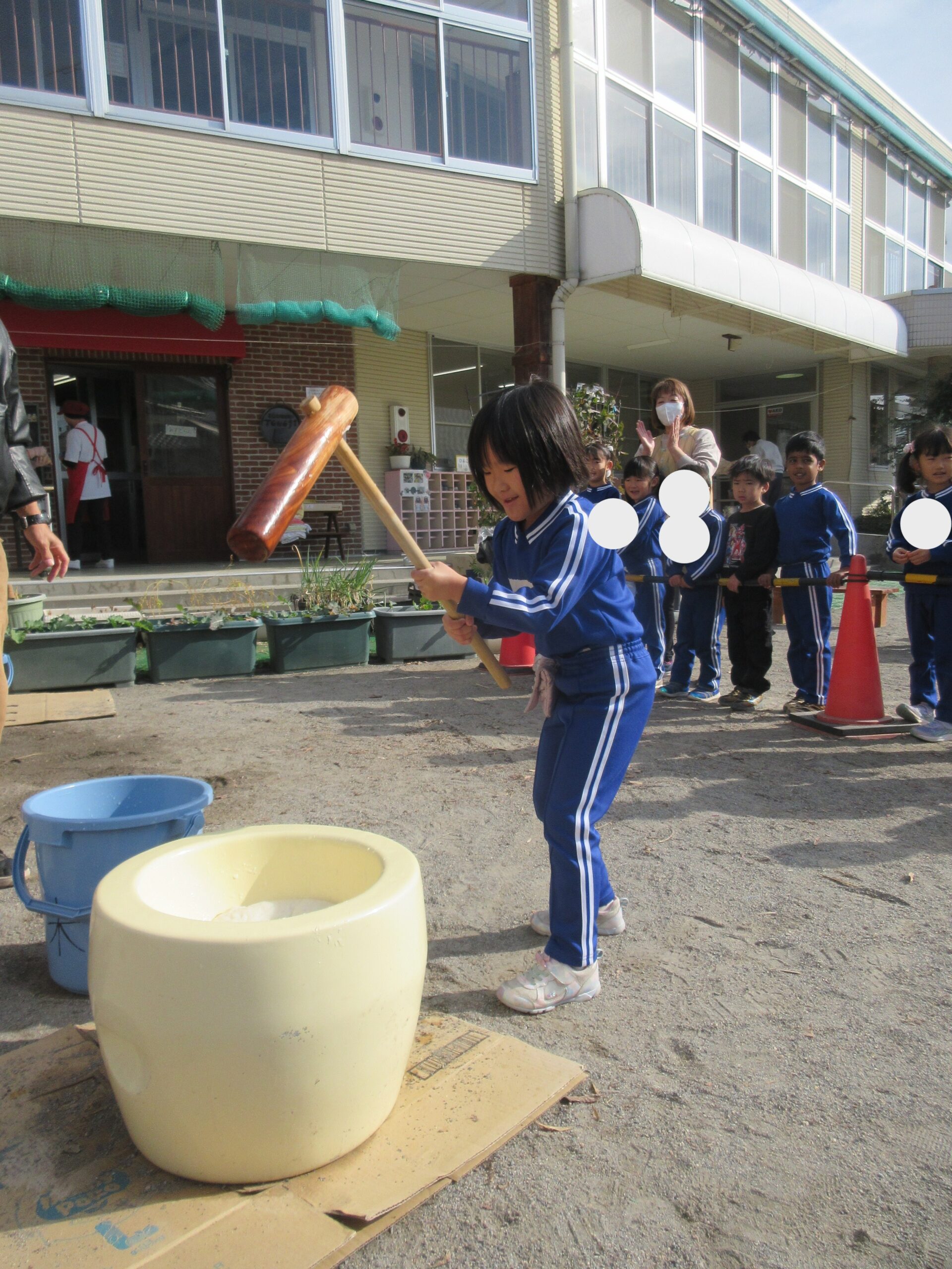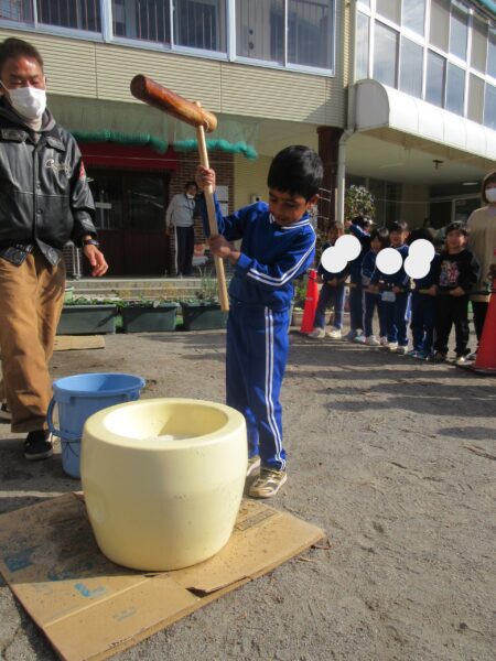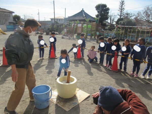 今日は、もちつき大会をしました。 前の日からとても楽しみにしていて、掛け声の練習をしているほどでした。 実際に元気な掛け声と一緒に、どの子も頑張ってついていて、よ~く伸びる美味しい餅になりました。お昼も、「たくさん食べた~い。」と食べる前から、期待を寄せている子どもたちでした♪