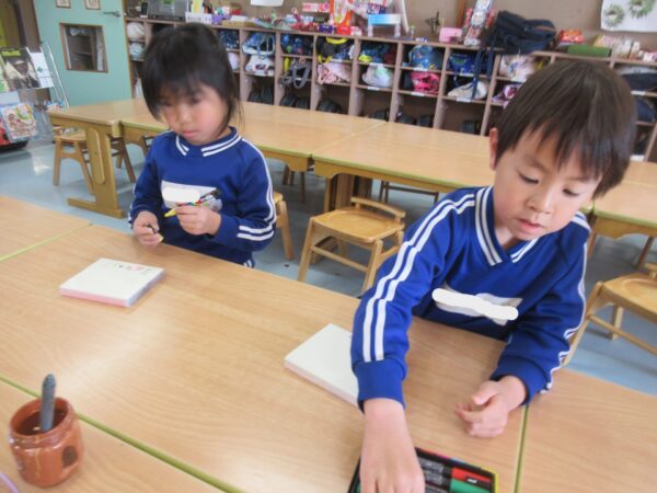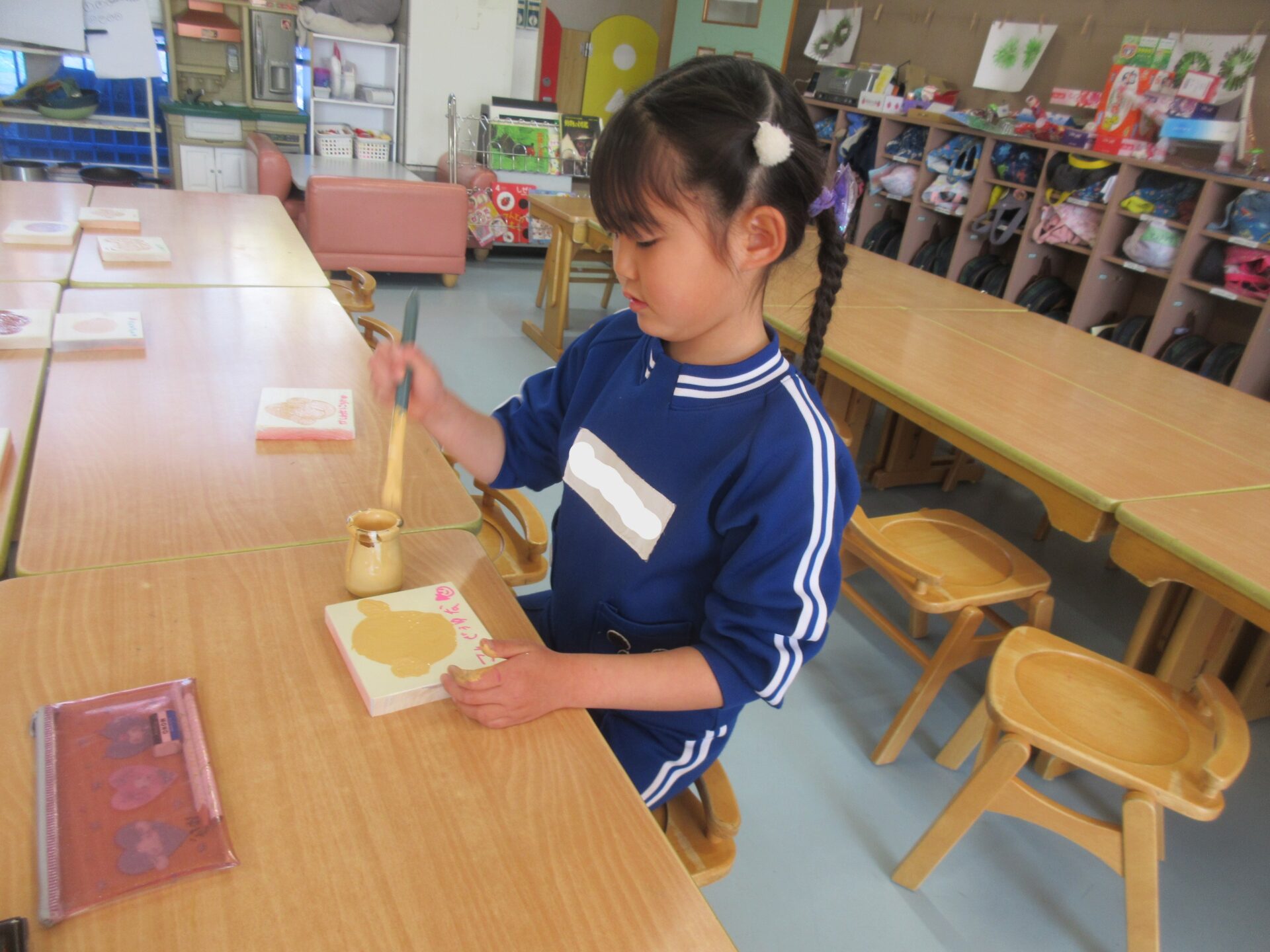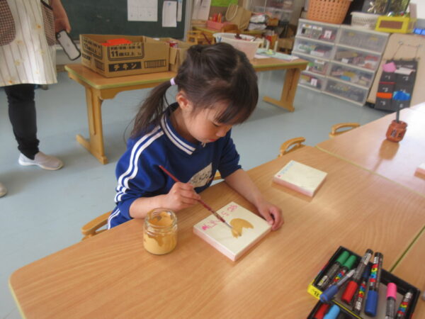 自分の名前を好きな色でカラフルに描いたり、ペンキを使って顔を描きました。