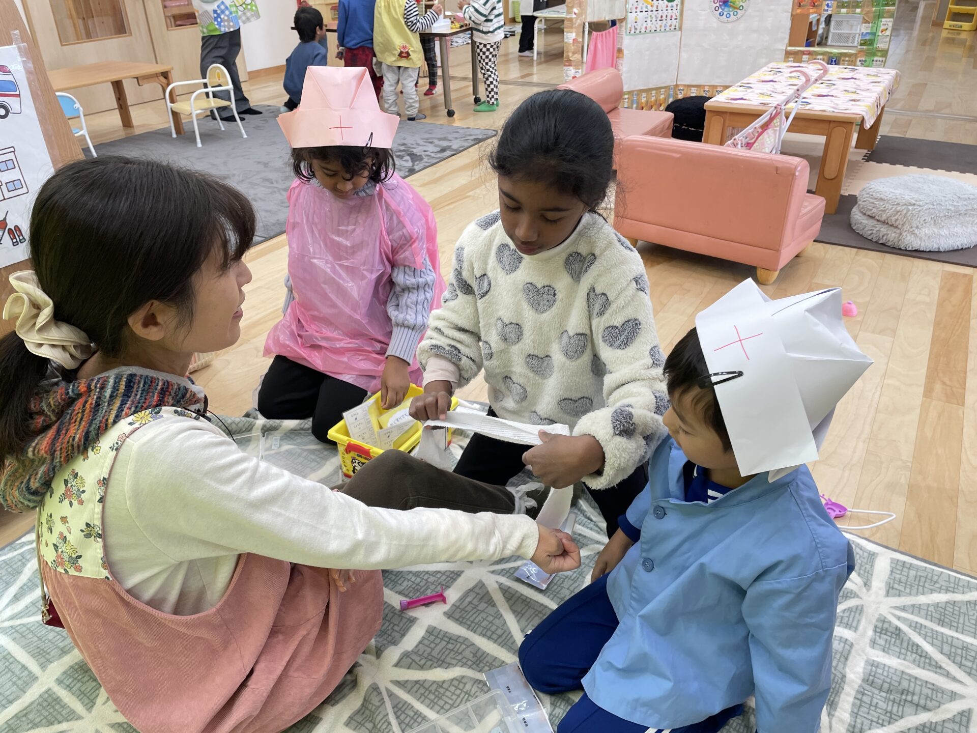 病院ごっこでは、画用紙で作った帽子と袋で作った衣装を着ると、より病院の雰囲気を味わうことができました★「熱がありますね」「けがをしているので、包帯をしましょう」などとなりきっていました♪