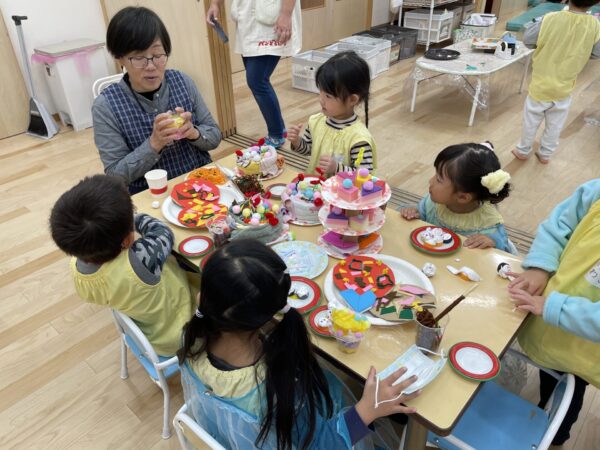 今週は、ひな祭りがあったので、アートコーナーで食べ物を作り【ひな祭りパーティー】を行いました♪毛糸を使ったパフェ・紙皿とトイレットペーパーの芯を使ったアフタヌーンティー・段ボールを使ったピザなど、たくさんの食べ物が並ぶパーティーになりました!!