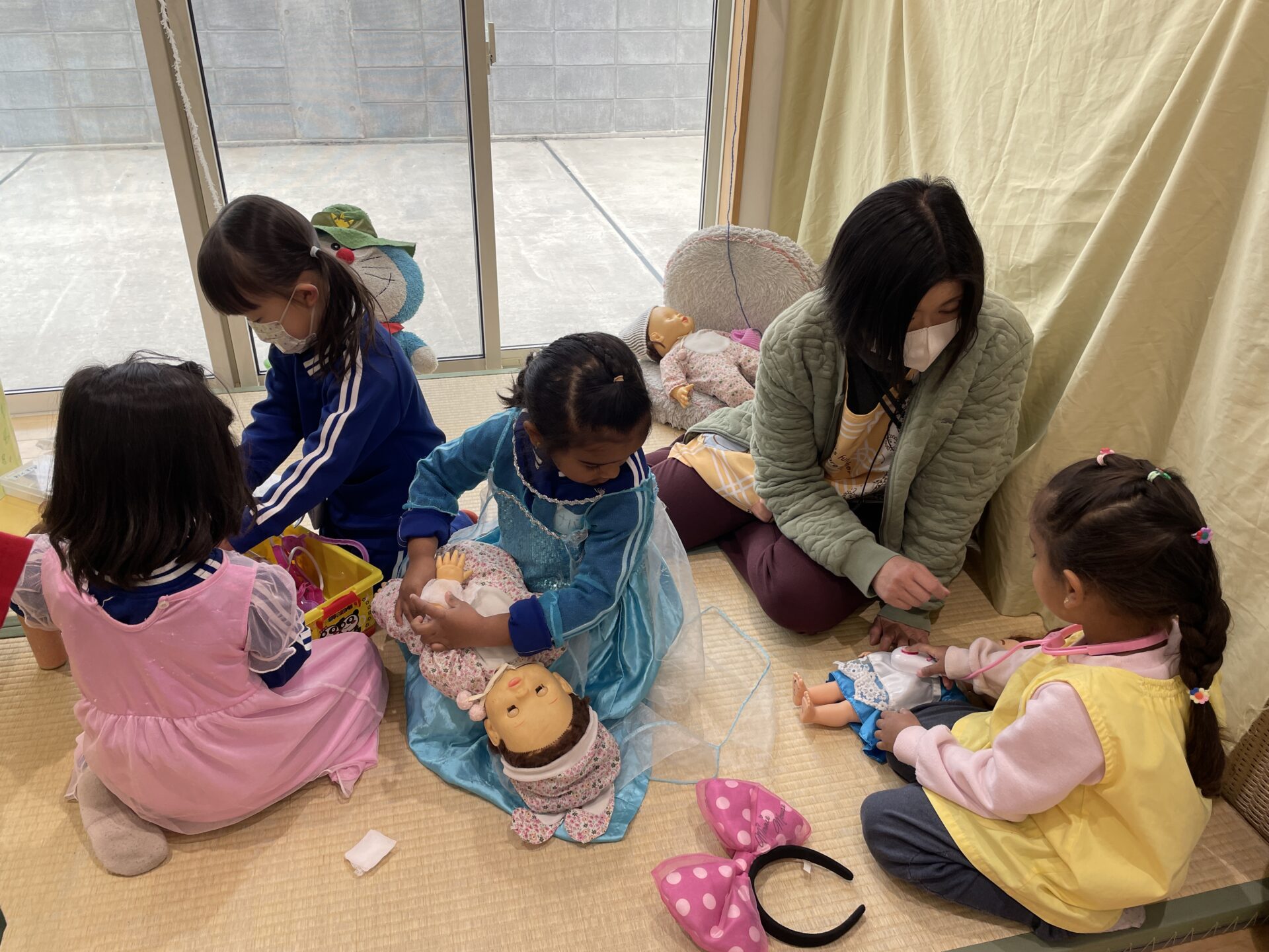 病院ごっこでは、新たに包帯やガーゼ・手作り点滴や消毒を用意したことで、よりごっこ遊びが盛り上がっていました。