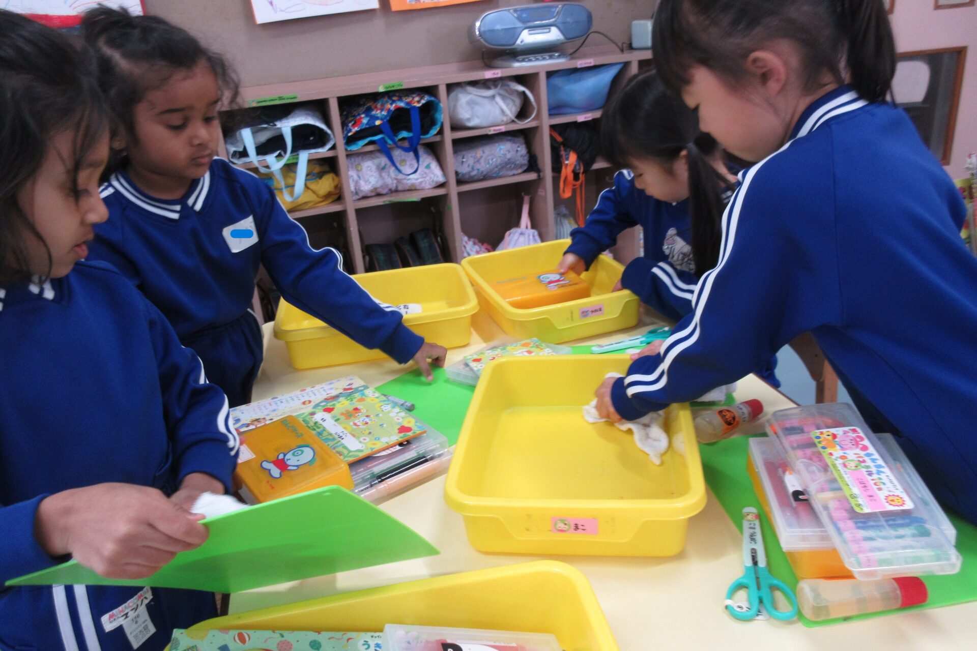 今日は、1年間使ったクレヨンや、はさみ、ペンなどの確認をしながらきれいに拭いたり、お道具箱の中を整理整頓をしました。