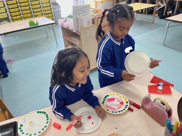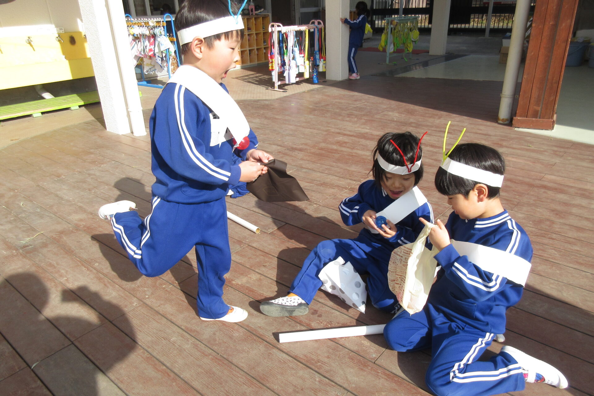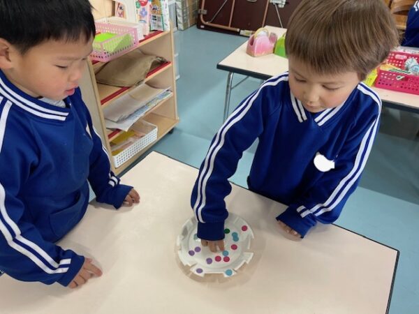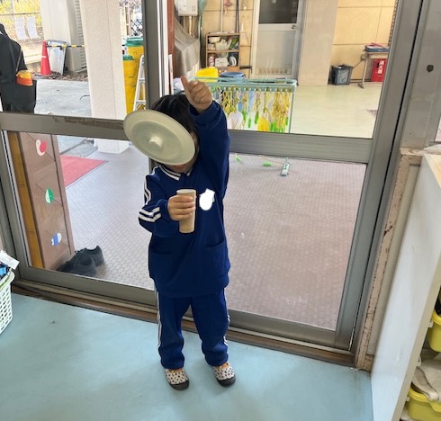 紙皿で作ったこま。切り込みを入れたり、模様をつけたりして作っていました。回し方によっては、いろいろな回り方をすることに気づき、試しながら楽しんでいました。材料をアトリエに取りにいき「回せるものって他になにがあるかな」と素材を探していると、カプセルを見つけ、変身ベルトを作ることを考えました。どんな風につけるか、どんな風に作るかを考え工夫し、難しい部分は保育者と一緒に。イメージや考えを伝え合い作りました。子どもたちは大満足。かっこいい!