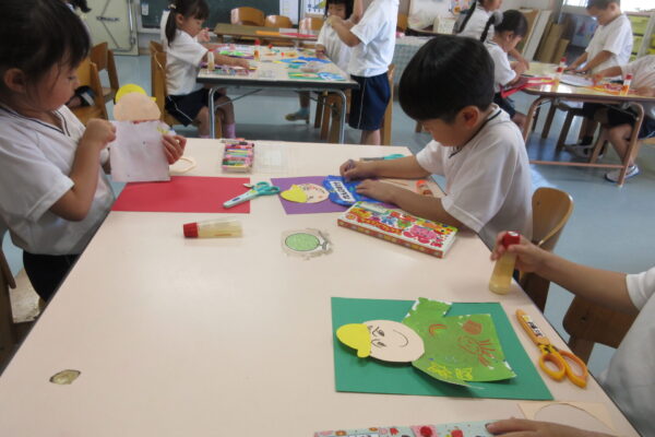 旗作りの続きもしました。ハサミで画用紙を顔の形に切り、顔を書いたり、帽子をかぶらせたり、「自分」が完成しました♪