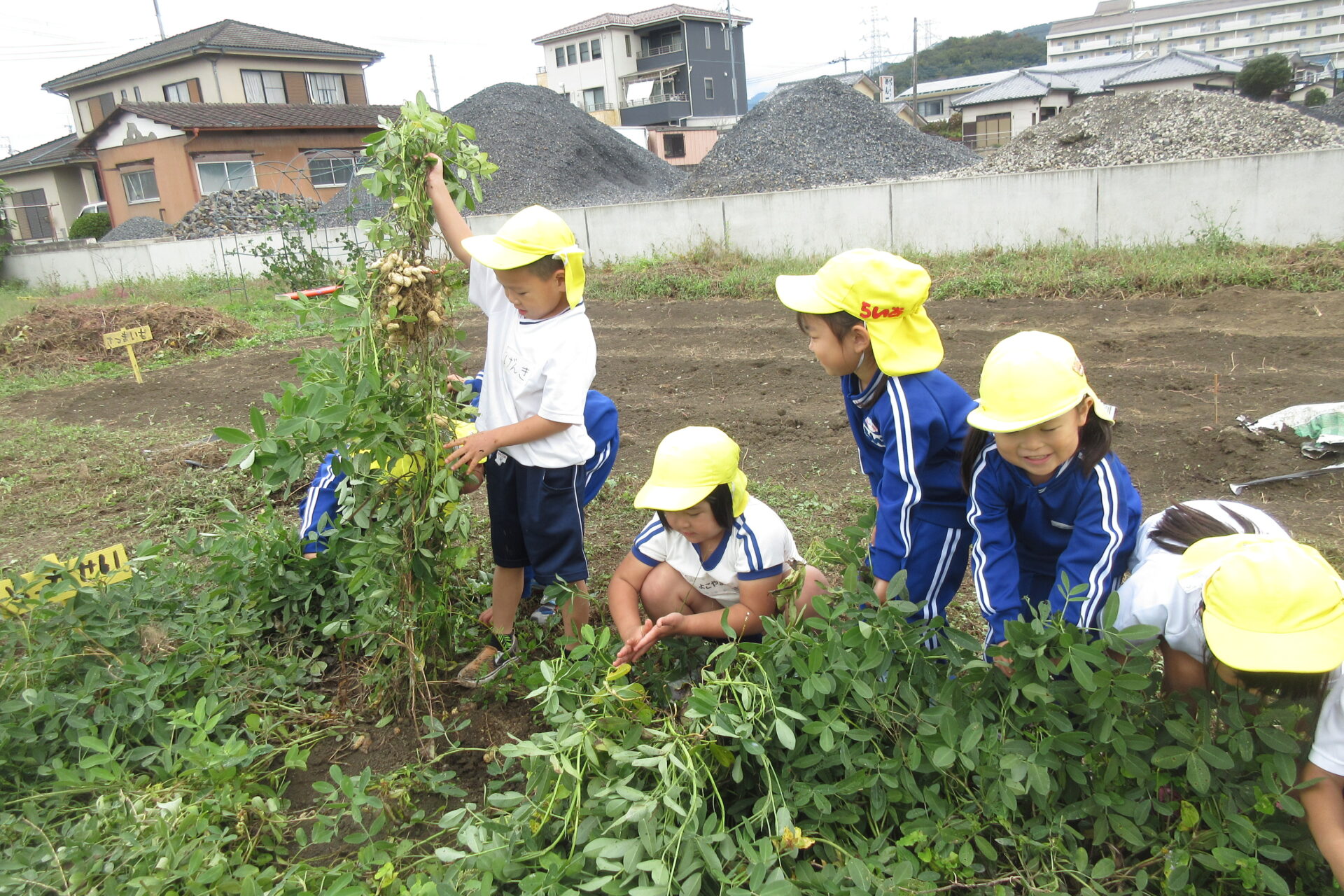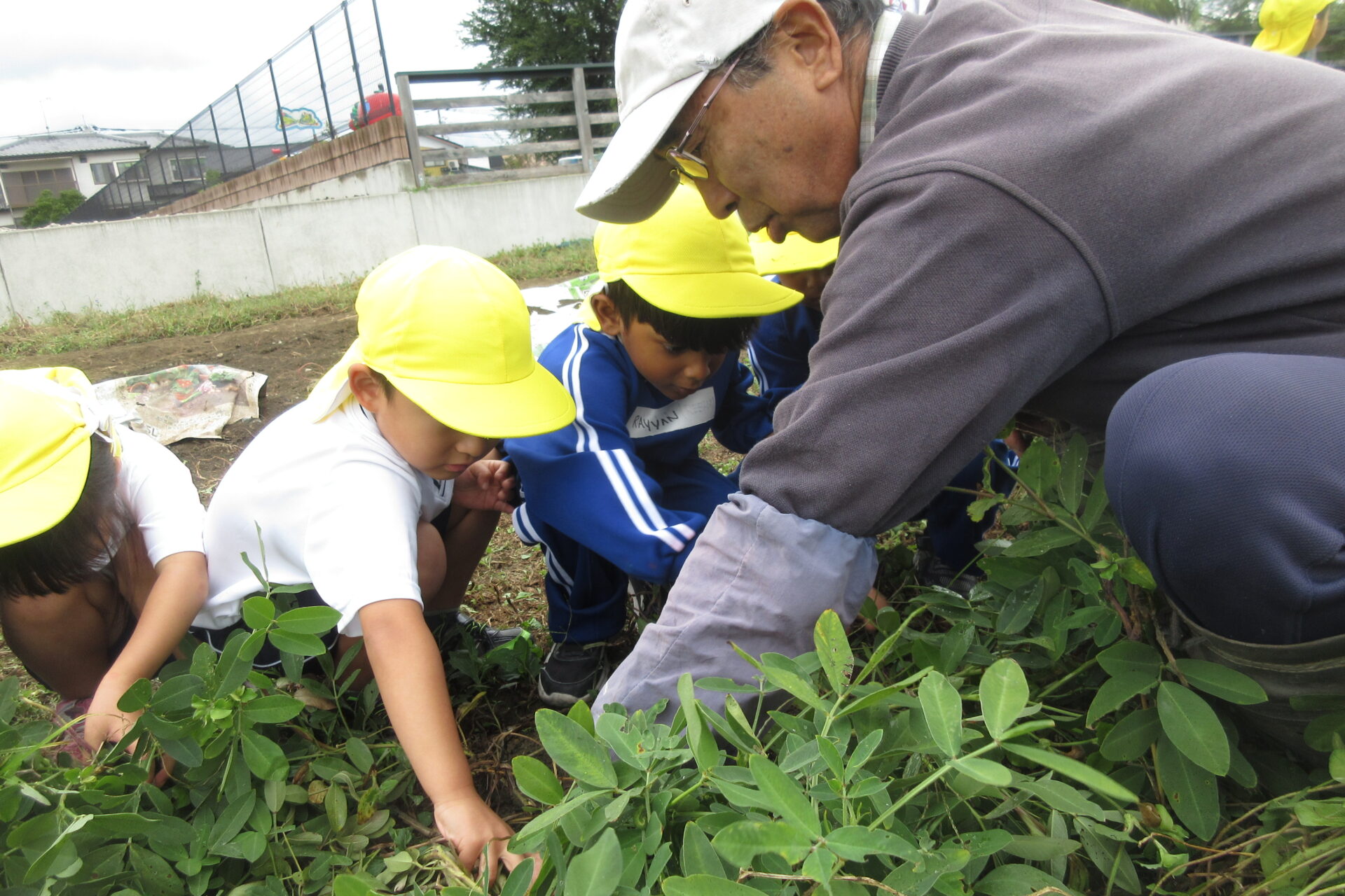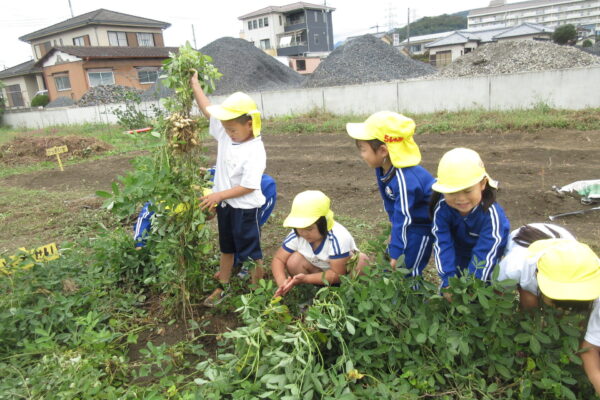 今日は落花生を収穫しに畑に行きました。落花生は、どんな形なのか、色なのか、土の中になっているのか想像を膨らまし、楽しみにしながら畑に向かいましたよ。 掘り方を大島先生に簡単に教えてもらった後、自分たちでいざ掘り始めると、最初はなかなか抜けずにいましたが、根っこの近くを持ってひっぱったり、、数本まとめて一緒にひっぱるとたくさん収穫できて、とても喜んでいました♪