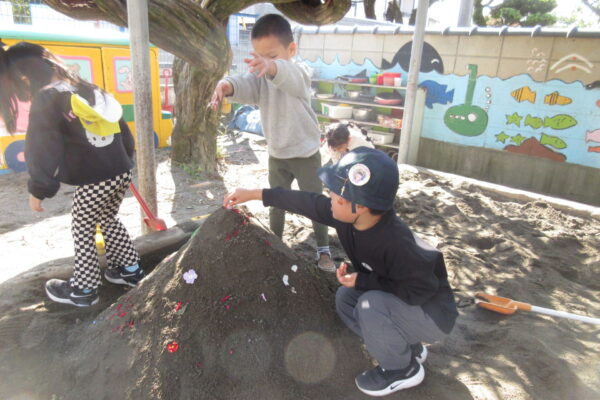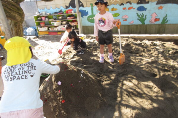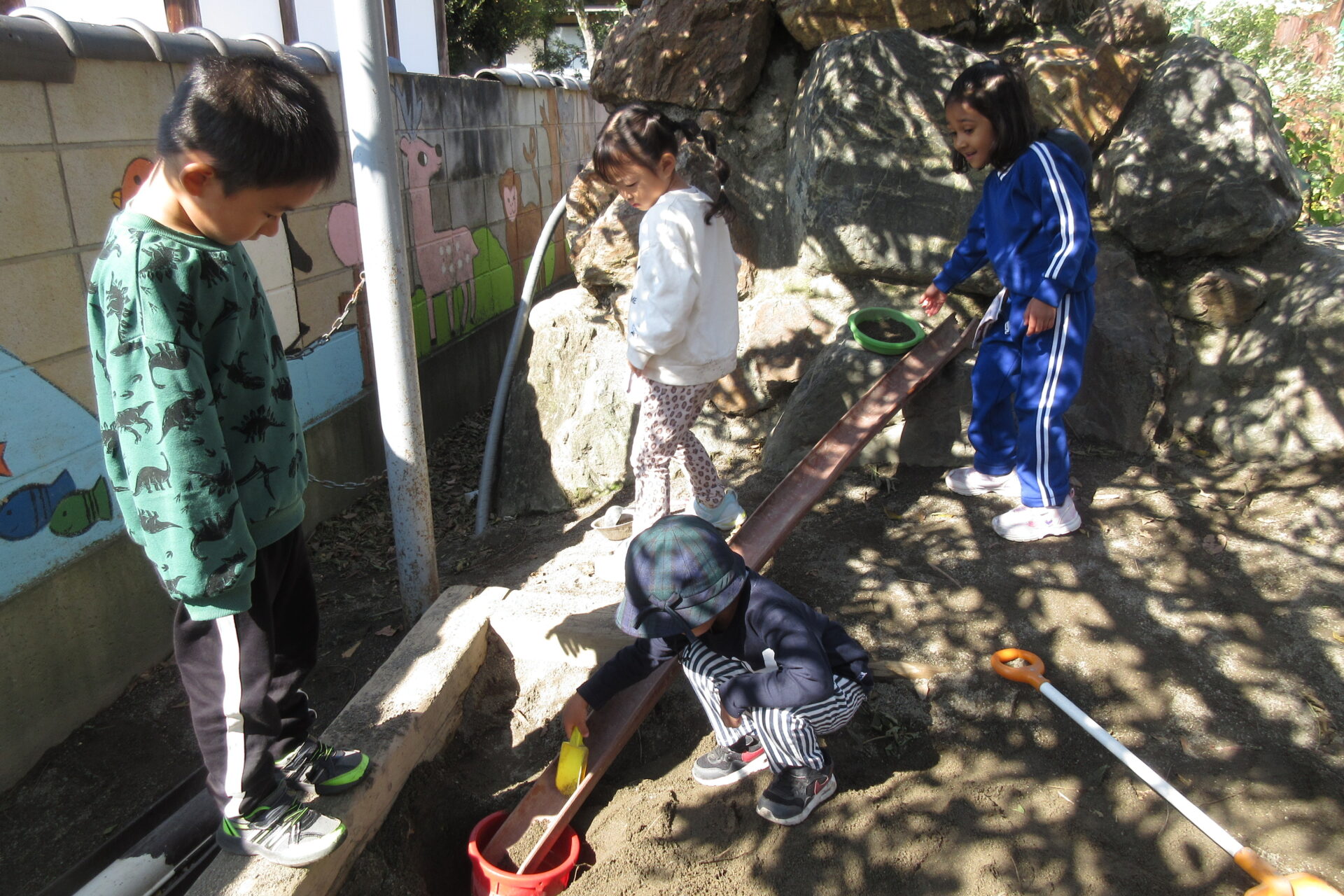 お砂場では、お友だちと一緒に山作りをしていました。山が大きく出来上がると、表面に花を飾っています。花が砂で落ちてこないように今度は山に穴をあけ始め、そこに花をおいていく事に相談して決まっていました。もう1か所では、樋を斜めにかけて、水や砂を流していました。