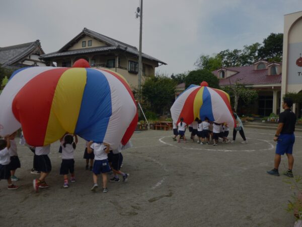 体育教室は、園庭でパラバルーンをやりました。音楽に合わせて元気よくパラバルーンを動かしています♪