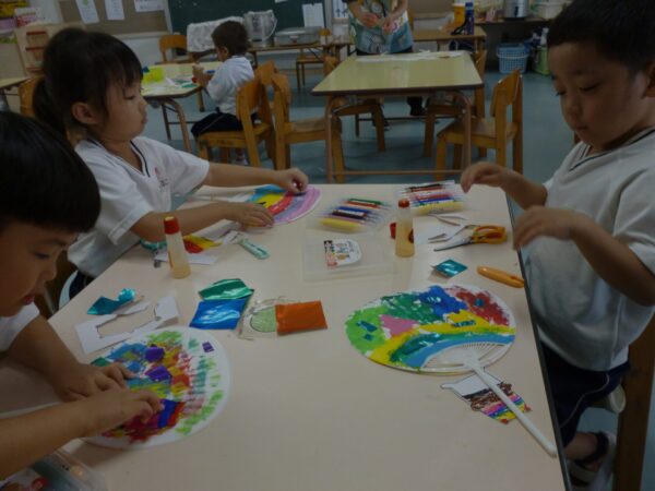 おうちの方に渡す、うちわのプログラムも完成しました。絵の具でスタンピングしたうちわに、ヌーヌーに色を塗って切って貼ったり、きれいな折り紙を切って貼りながら素敵なうちわプログラムが出来ました。来週もち帰りますのでお楽しに!!「
