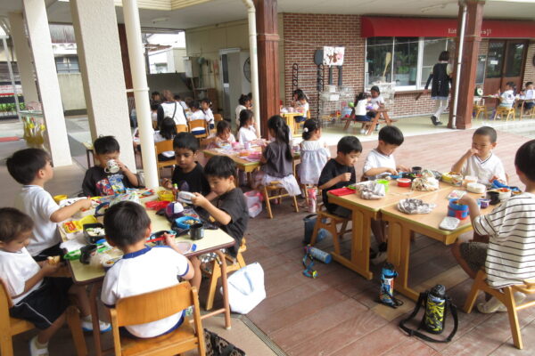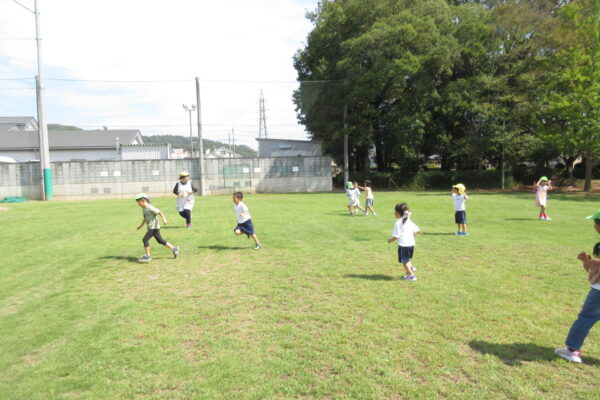今日はふじ組さんと一緒に篠生神社まで散歩に行きました。 グラウンドぼうしとりごっこをしながら思いっきり芝生を走りました。 葉っぱの迷路の所では、セミの抜け殻や木の実を発見し、いっぱい見つける!とはりきって探している姿が見られました。 園に帰ってからは、ウッドデッキや廊下でふじ組さんと一緒にお弁当を食べました。 「今日のお弁当おいしかった!」と嬉しそうにお話していました。