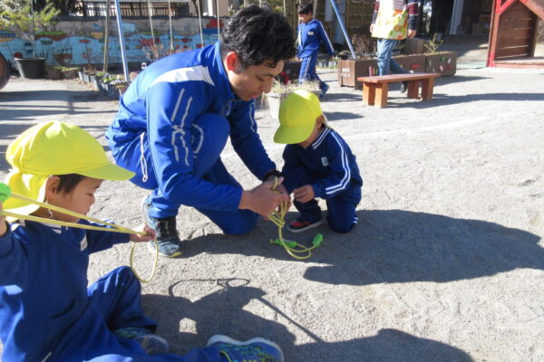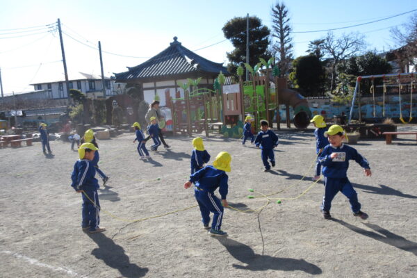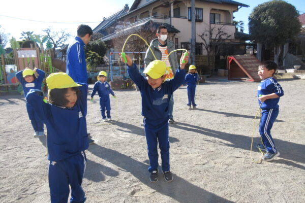 3学期最初の体育教室は縄跳びでした。縄をしっぽにして、しっぽ取りゲームをしたり、縄を踏まないように気をつけながら前や後ろ、左右にジャンプをして少しずつ縄に慣れていきました。 バンザーイとしながら縄を前に回して、ジャンプ!この動きを繰り返しやっていきながら前とびがだんだんと跳べるようになってくるそうです。 遊びの中でも短縄に挑戦する子が増えてきました。たくさん励ましたり、保育者も一緒に縄跳びをしながら寒い日でも体を動かしていきたいと思います。