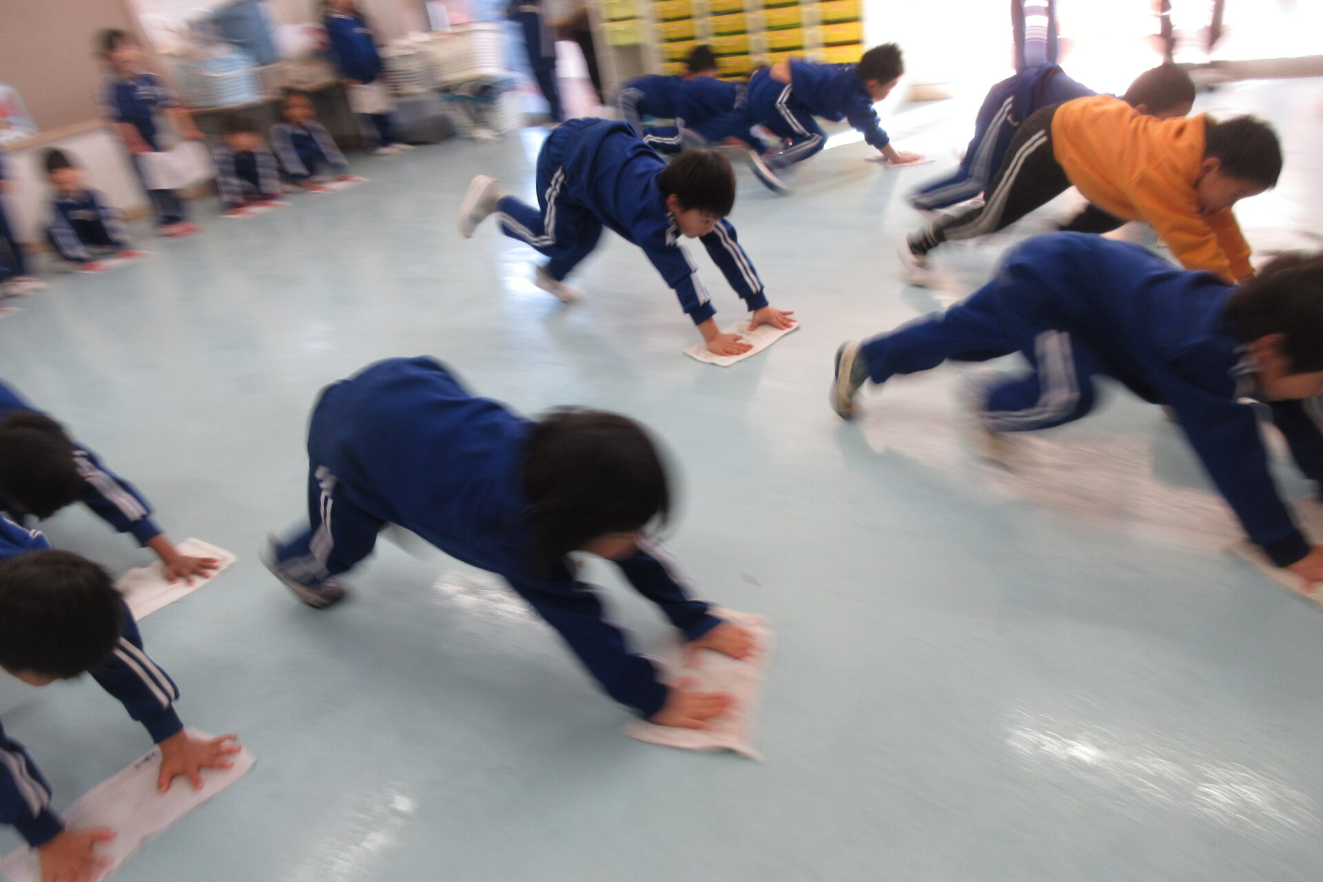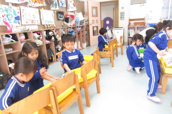 今日は、お道具箱の中を整理整頓したり、保育室のロッカーや床を掃除しました。床はグループごとにリレーをして遊びながらみんなでピカピカにしていきました。