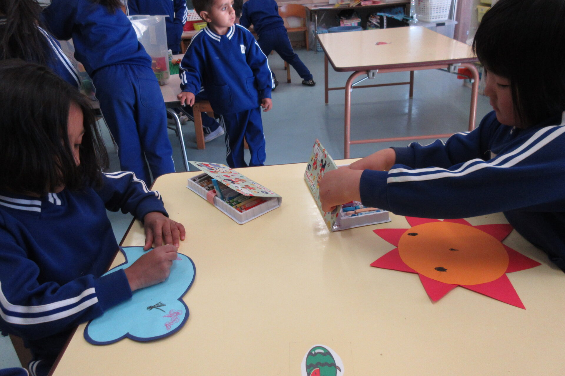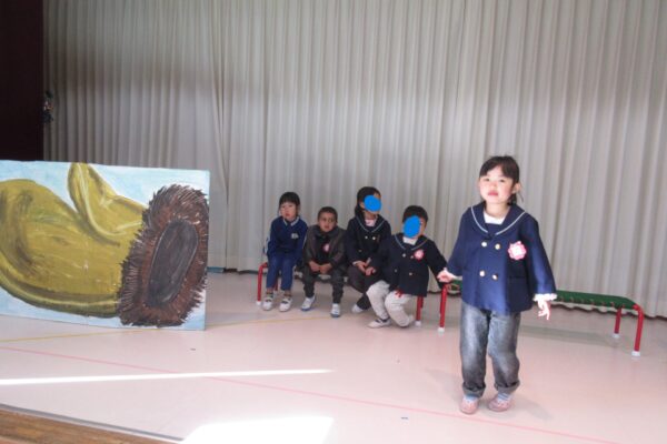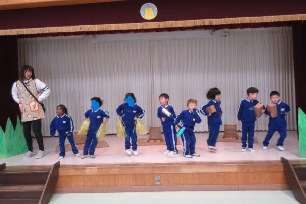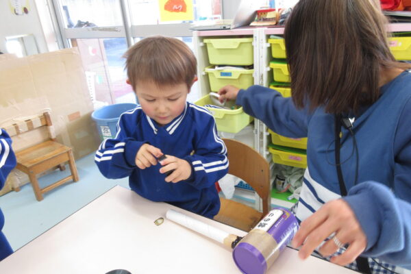オペレッタに必要な小道具を一緒に作っています。「3匹のこぶた」はレンガ、わら、トンカチを作ったり、北風と太陽さんは、自分だけのお面作りをしました。てぶくろのおともだちは何が必要かな?