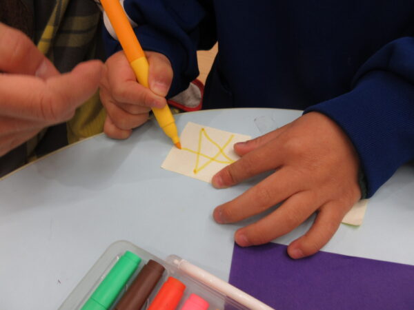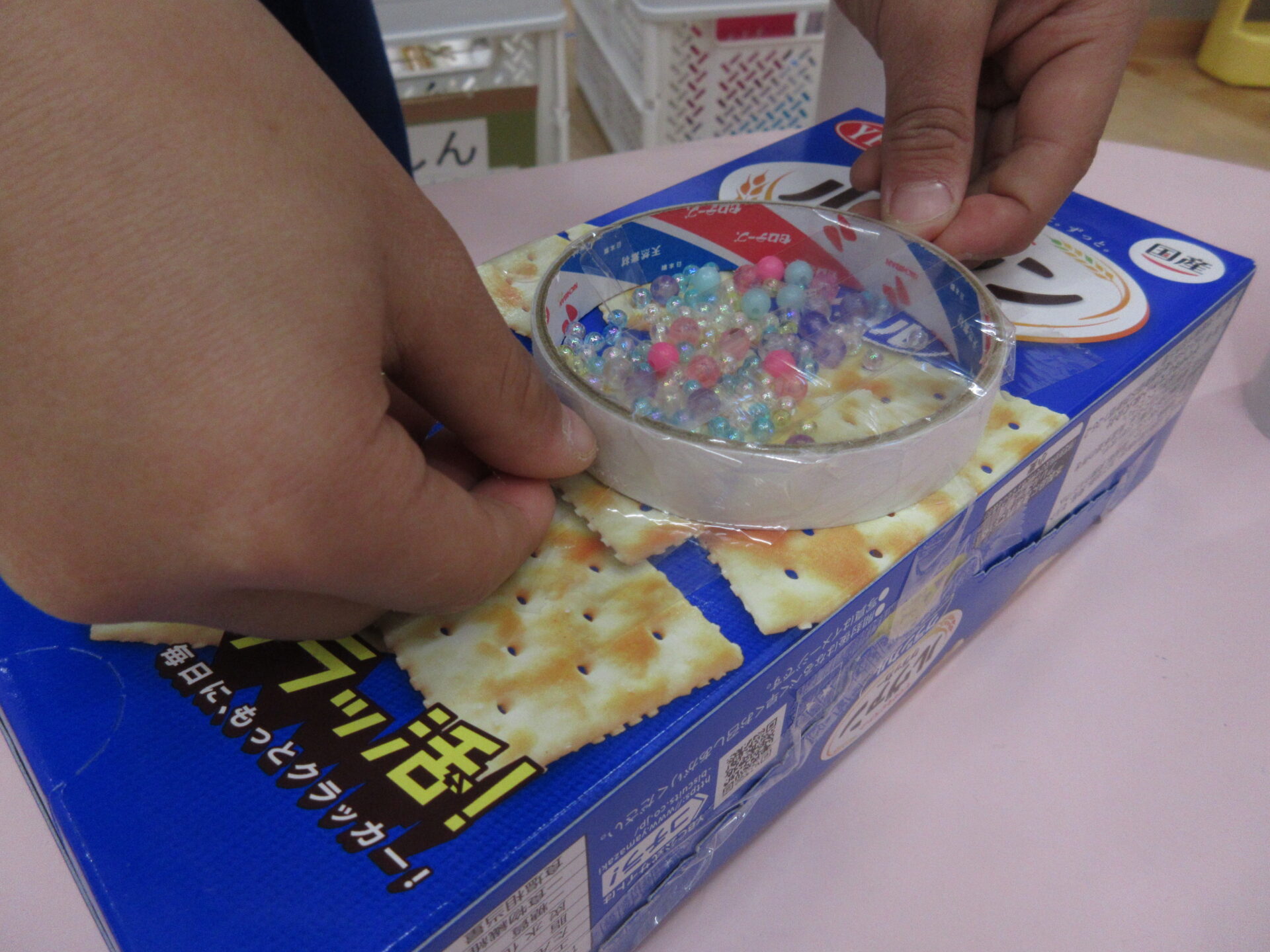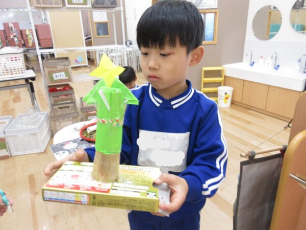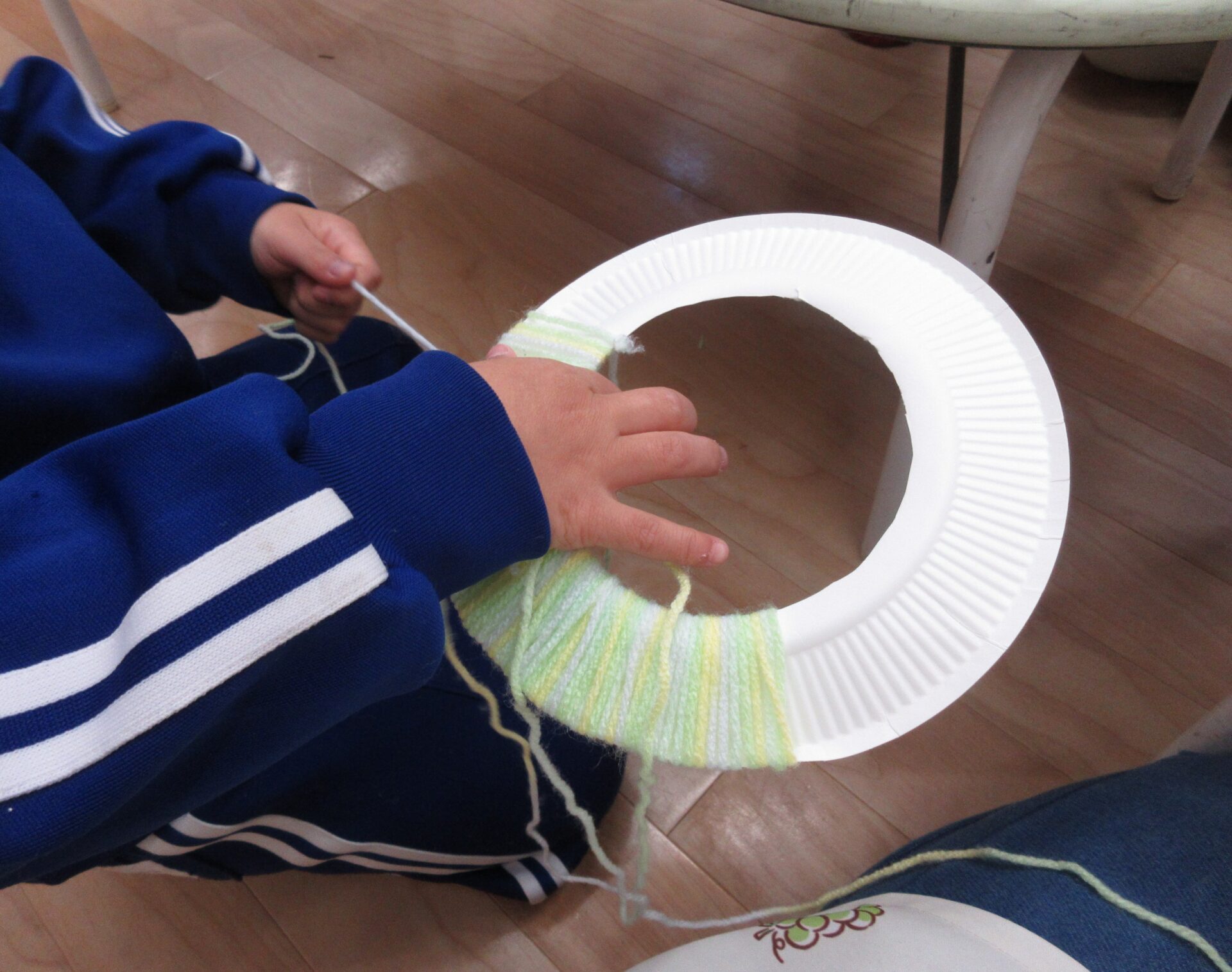 モールをクルクル巻いてリース作りの他に紙皿に毛糸を巻き付てリース作りも盛り上がっています。毛糸を巻いた後にビーズをボンドにつけてのせて、飾り付けもどれをつけようか夢中になって選んで付けています。折り紙やトイレットペーパーの芯を使って、オリジナルのクリスマスツリーを作ったり、星を自分で描いて作りたい!と保育者に聞いて、2回目は自分で作成して、満足したり、出来た喜びを味わう姿が感じられました。