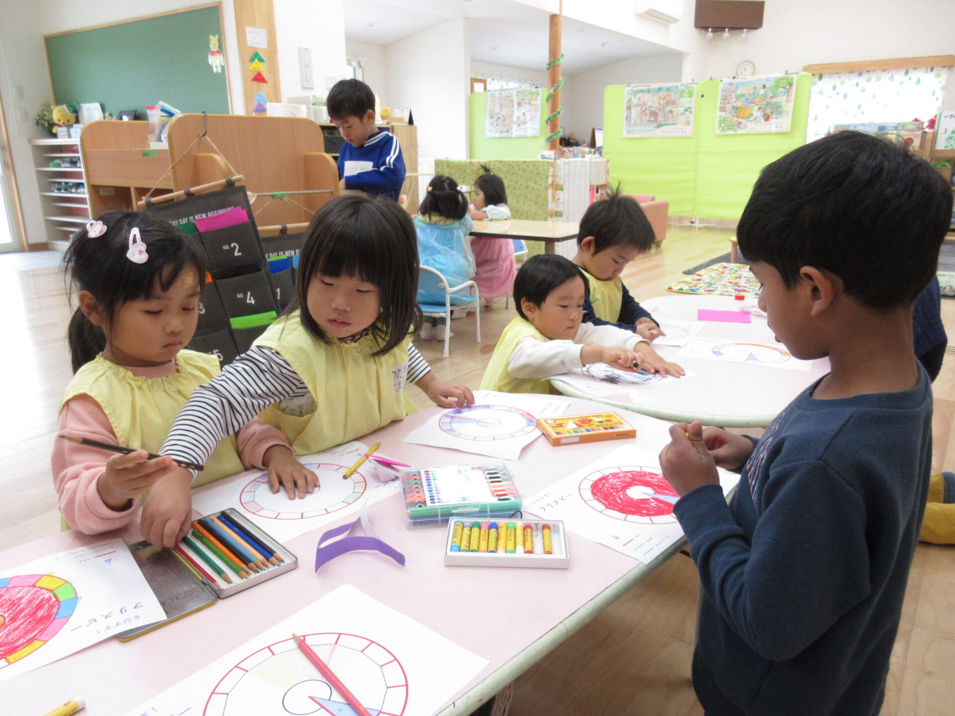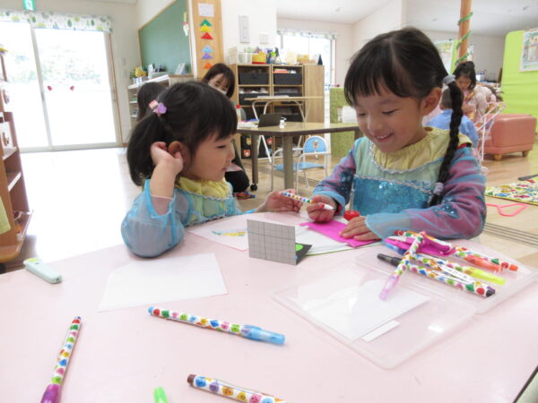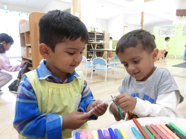 今週のアートコーナーでは、折り紙に切り込みを入れて高いところから飛ばすとクルクル回るものを作ったり、ままごとコーナーに持っていけるようなバッグを作ったりして楽しみました。
